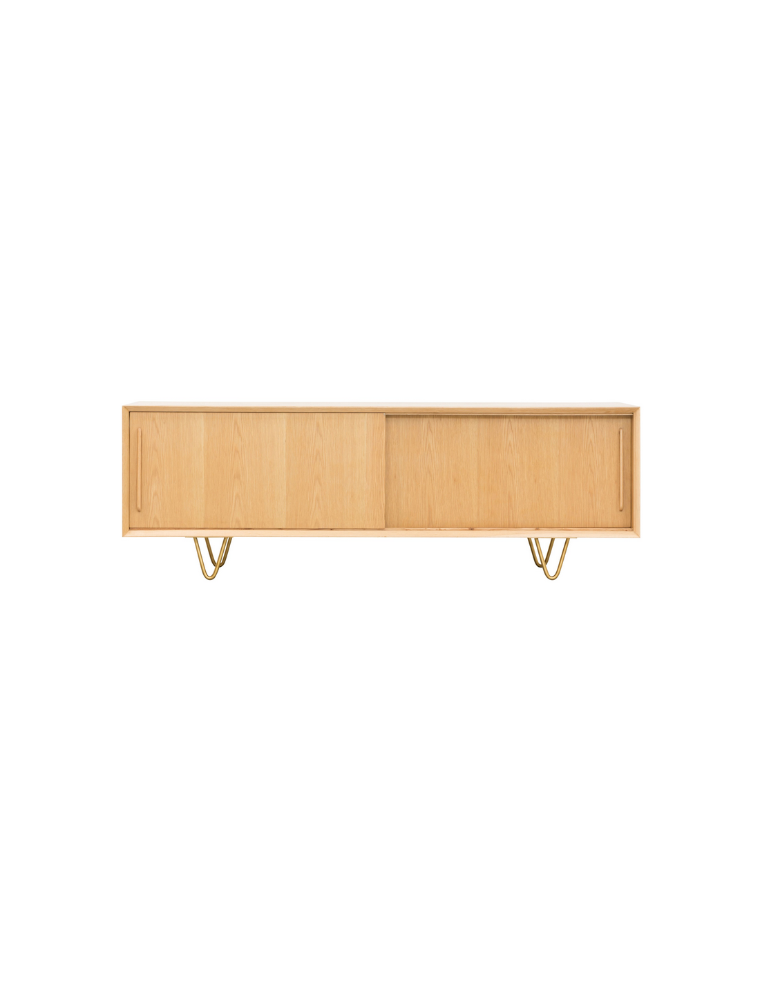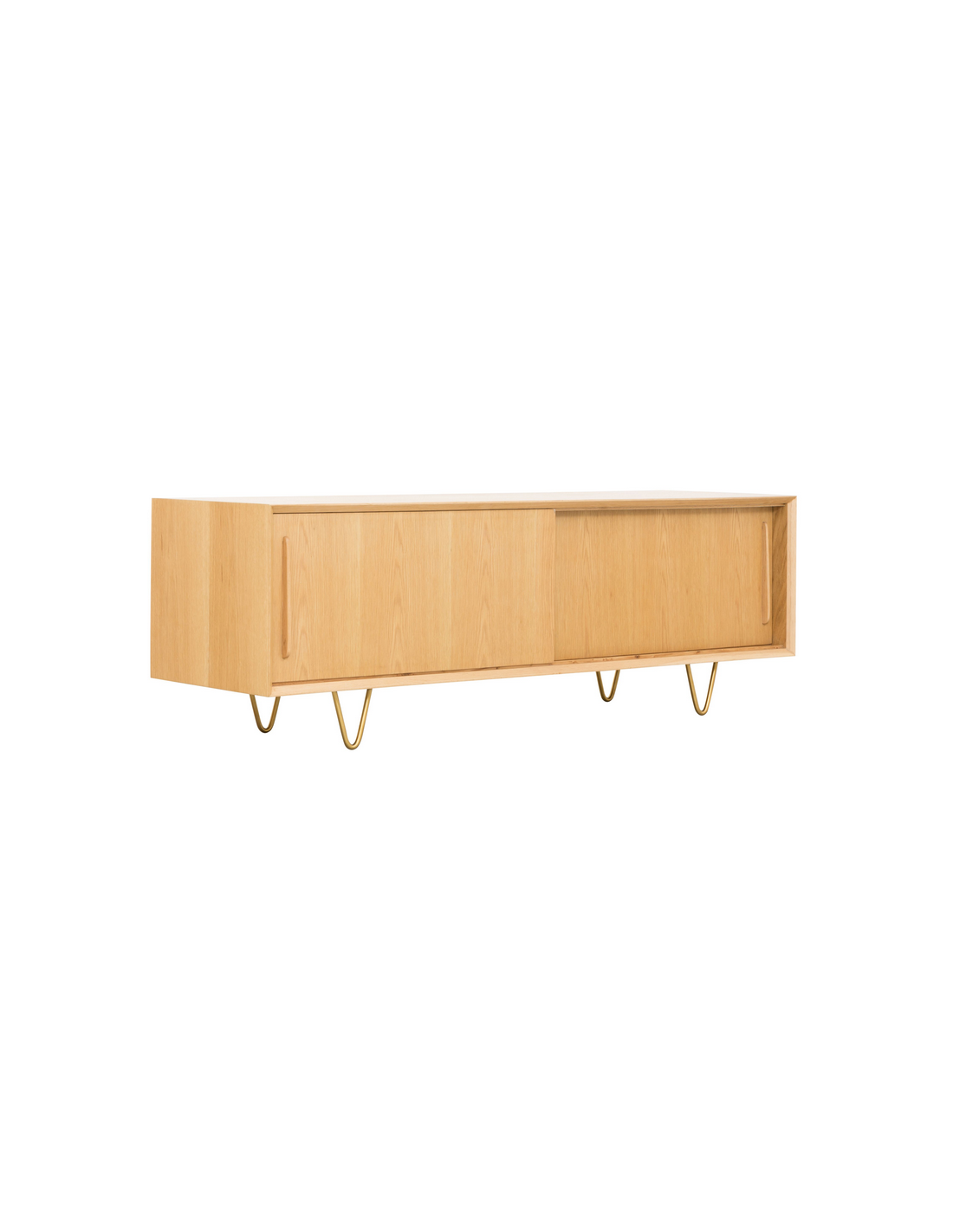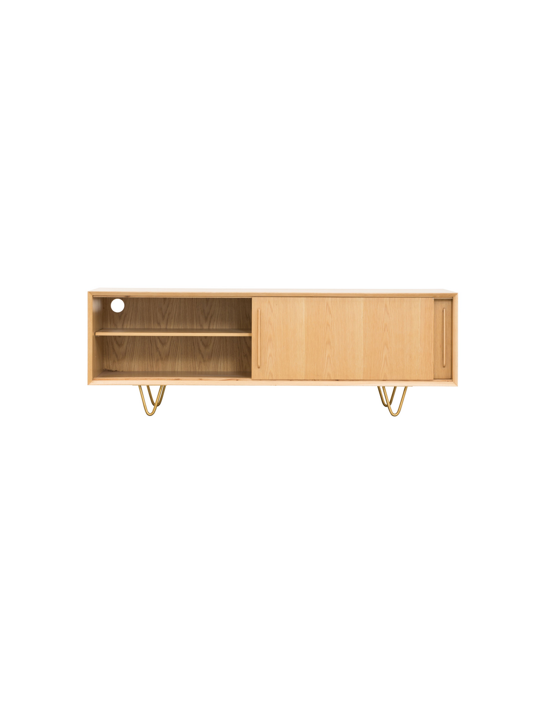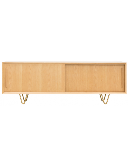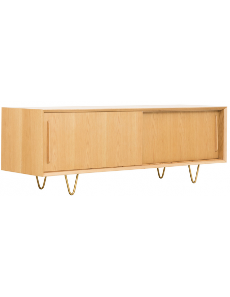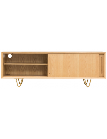Tvbord udført i et design af guldfarvet metal og egetræsfinér. Tvbordet har justérbare hylder i hvert af de 2 rum, samt skydelåger. Møblet måler 51 cm i højden og 150 x 45 cm i bredde og dybde.