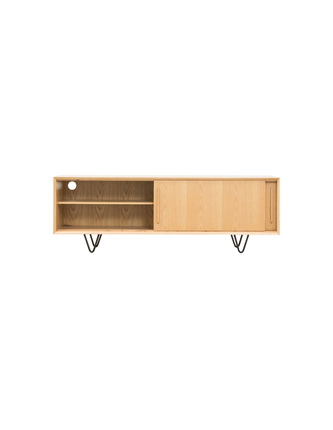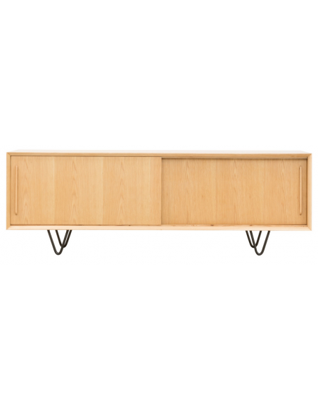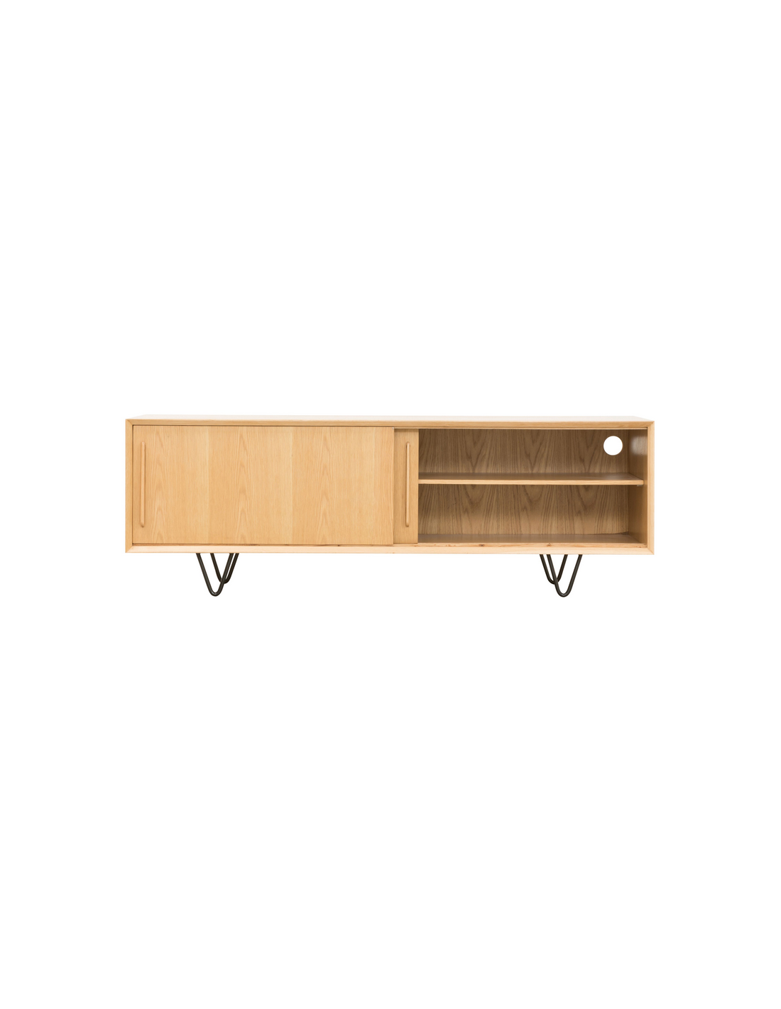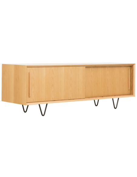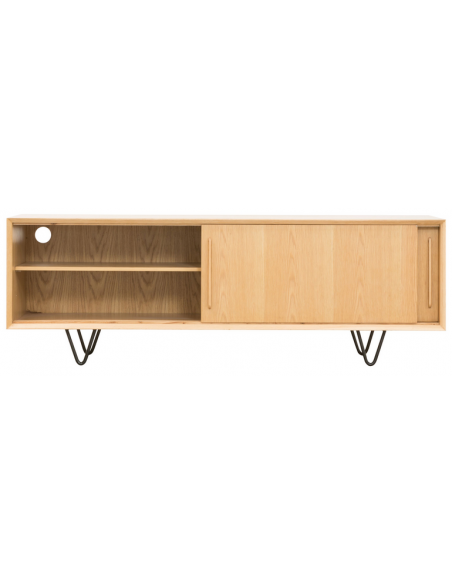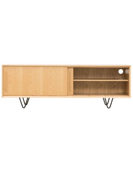 Tvbord udført i et design af sortlakeret metal og egetræsfinér. Tvbordet har justérbare hylder i hvert af de 2 rum, samt skydelåger. Møblet måler 51 cm i højden og 150 x 45 cm i bredde og dybde.