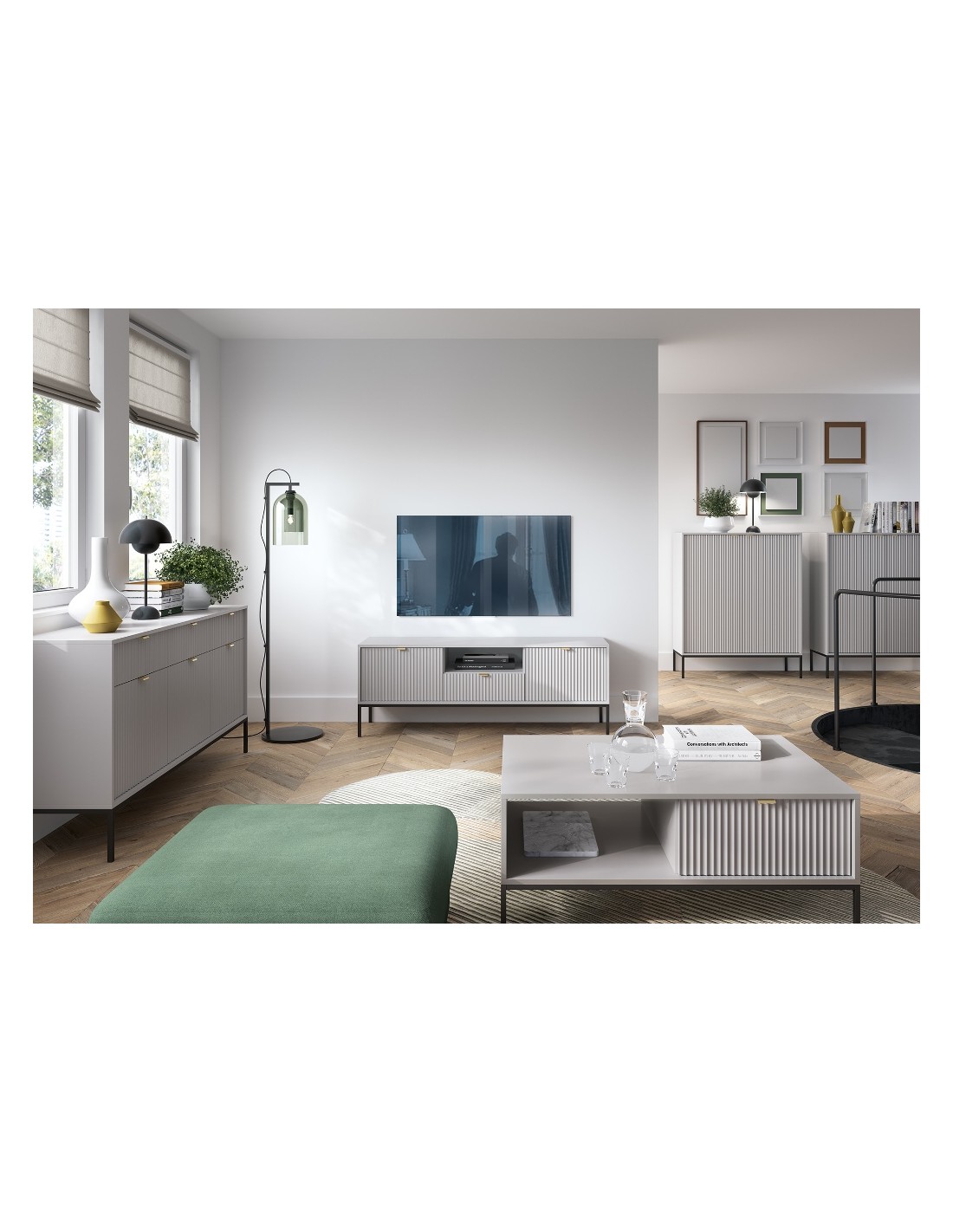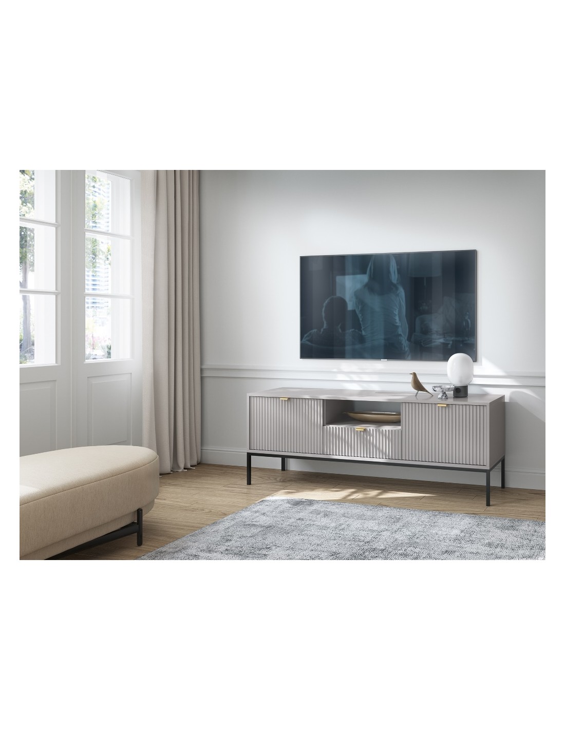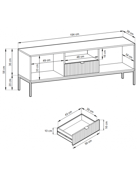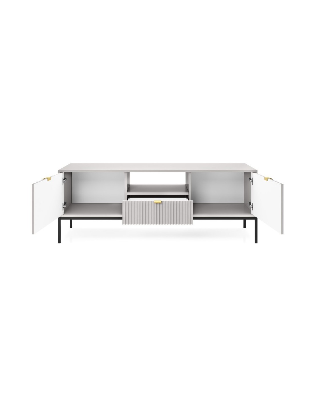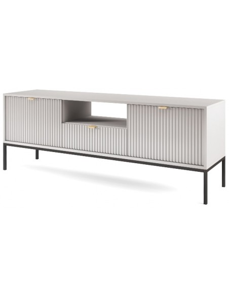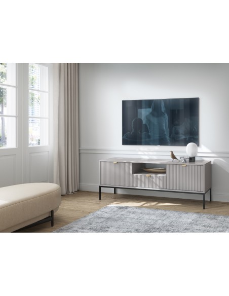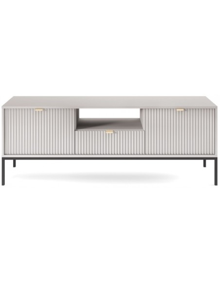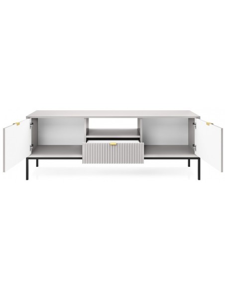 Nova tvbord udført i et design af sortlakeret metal og grå møbelplade med detaljer i guldfarvet metal. Tvbordet måler 56 cm i højden og 154 x 39 cm i bredde og dybde. Tvbordet indeholder 1 skuffe, 2 skabe og 1 åbent hylderum.