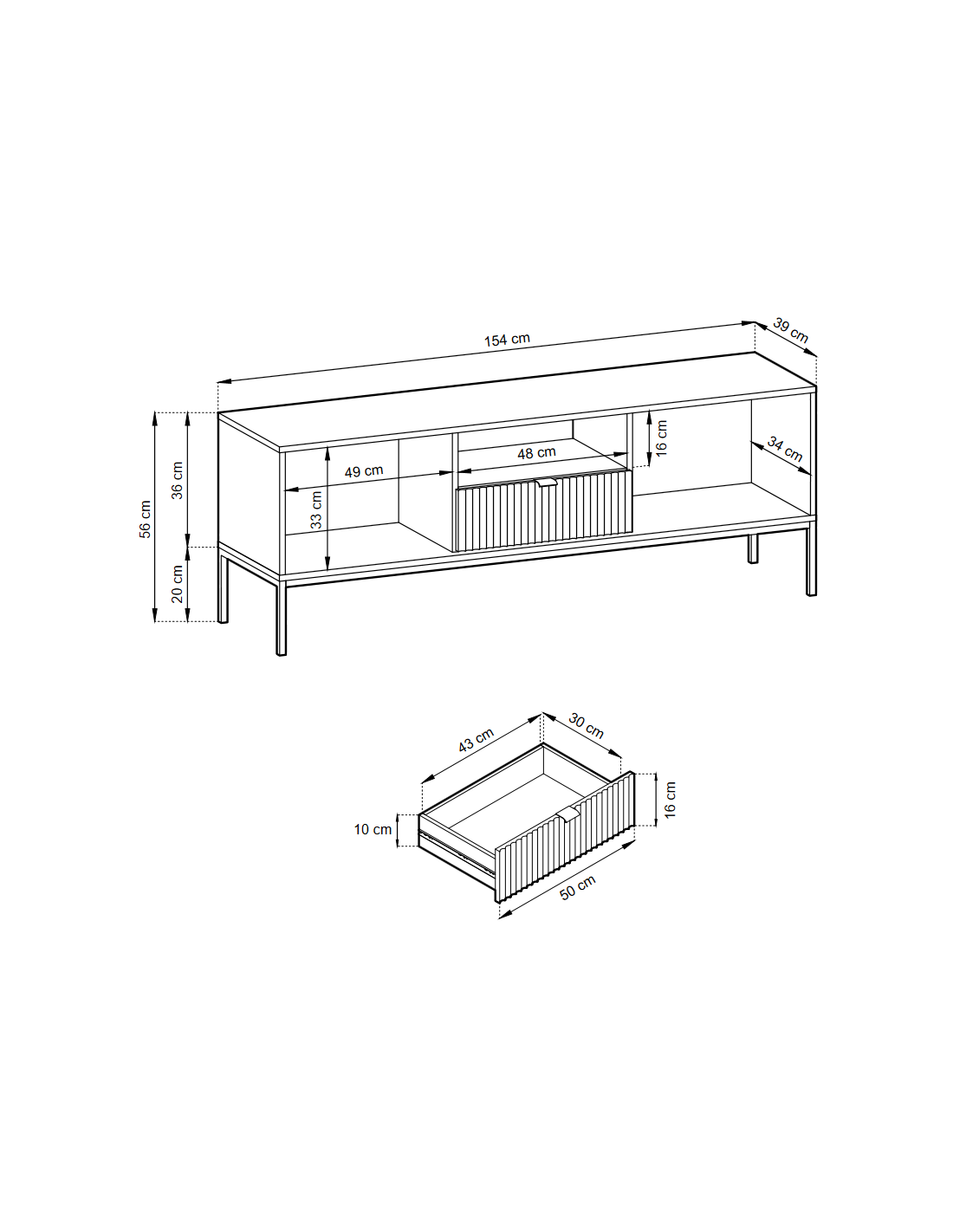 • 1 skuffe, 2 skabe og 1 åbent hylderum