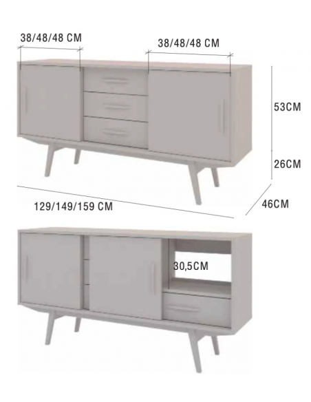Velvet trebino underskab til vask/e, udført i et design af mørk lakeret robletræ (egetræ). Underskabet måler 159 cm i bredden og 79 cm i højden. Underskabet indeholder 2 skydedøre, der begge gemmer på åbne hylderum, samt 1 skuffe i det ene skab. Midten er udfyldt med 3 skuffer på metalskinner med softclose funktion samt fuldt udtræk. Underskabet er velegnet til 1 eller 2 håndvaske, placeret i siderne henover skabene. Der er ikke forborede huller til afløb. Bagsiden er delvist åben til rørudførelse.