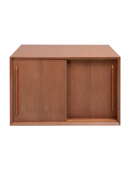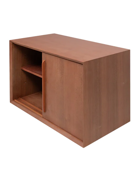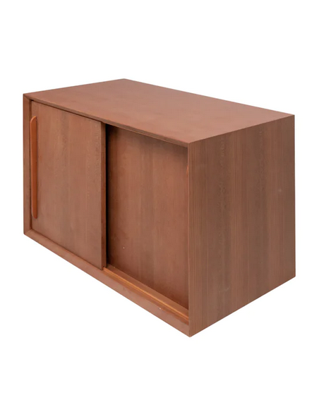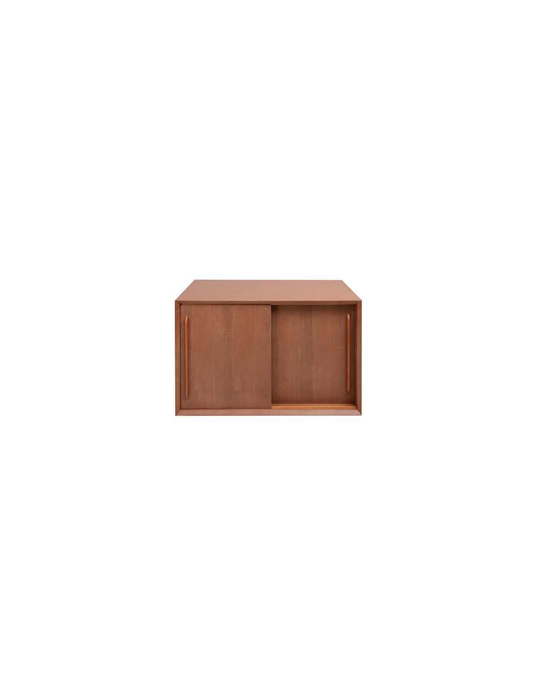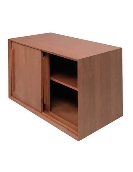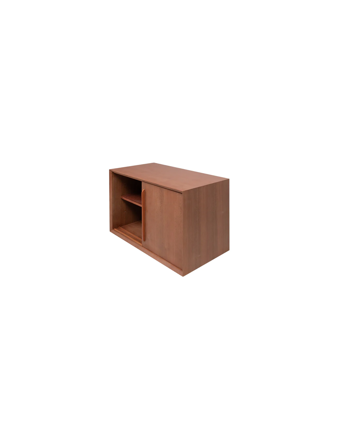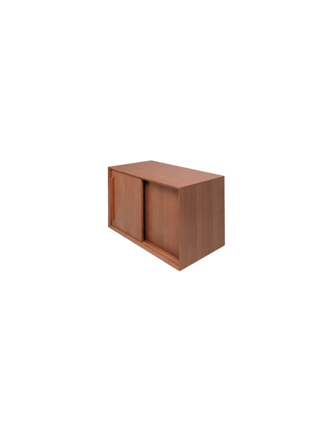 Vægmonteret underskab til håndvask og topplade, udført i et design af teaktræsfarvet MDF. Underskabet måler 51 cm i højden og 80 x 45 cm i bredde og dybde (ydermål). Til underskabet kan eksempelvis anvendes topplade (Klik her) hvor topplader med bredden 80 cm passer. I skabet forefindes 2 skydelåger og 1 hylder bag hver skydelåge.