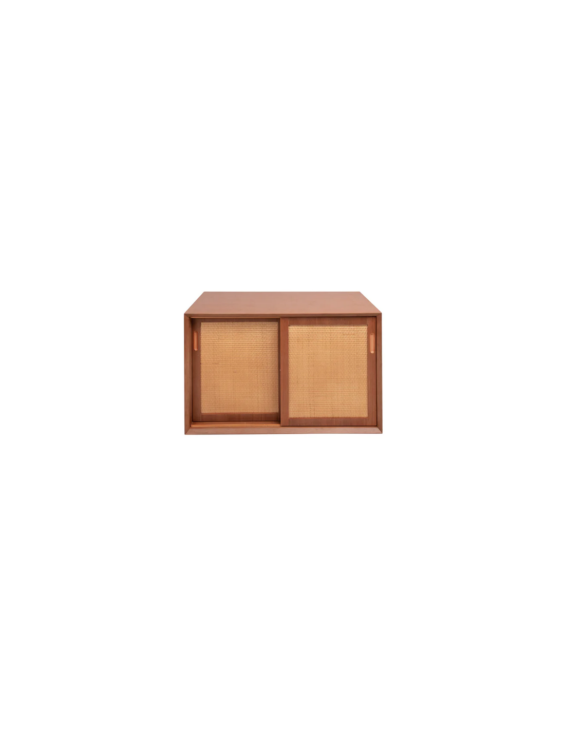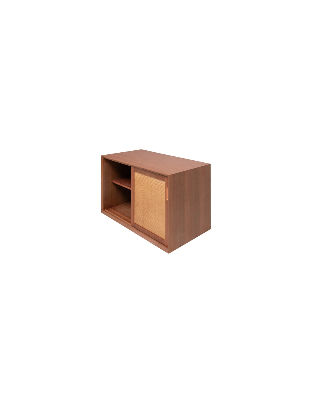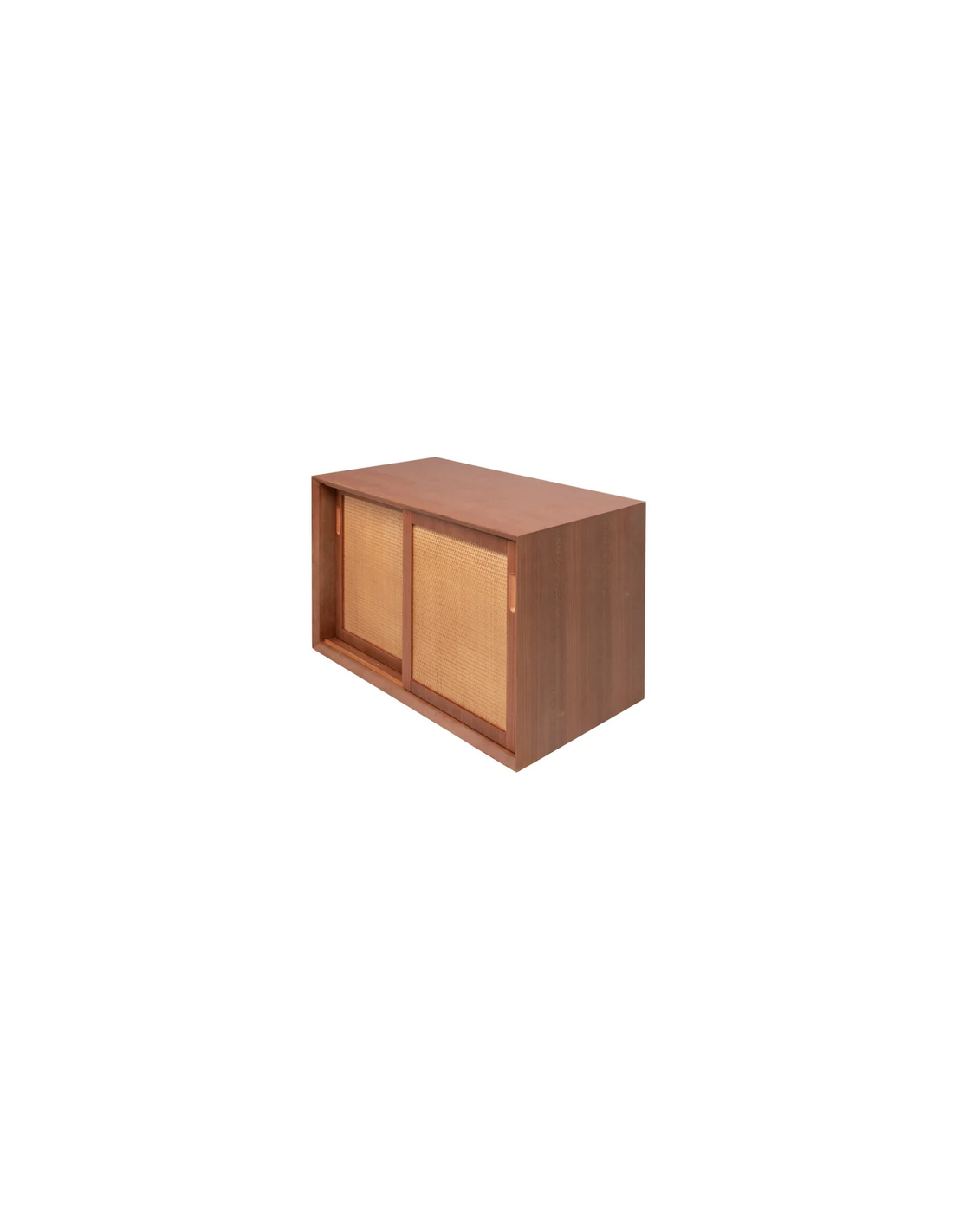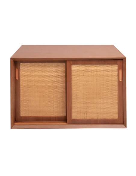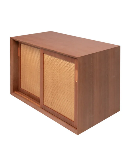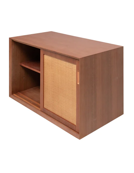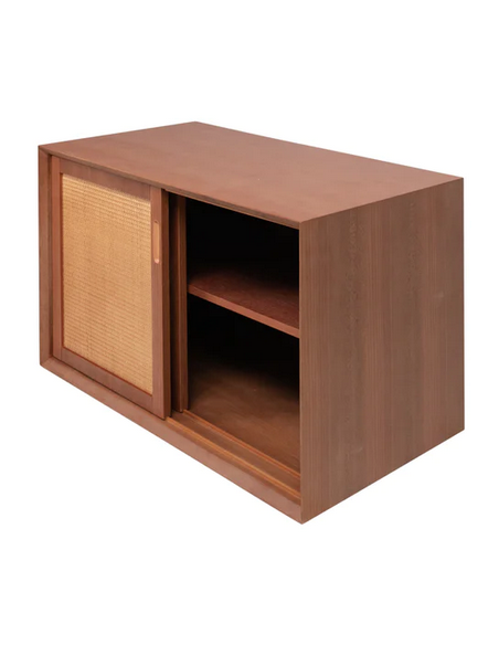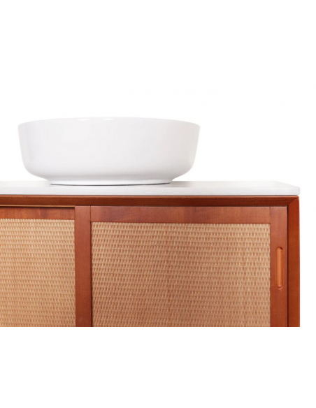 Vægmonteret underskab til håndvask og topplade, udført i et design af teaktræsfarvet MDF og naturfarvet rattan. Underskabet måler 51 cm i højden og 80 x 45 cm i bredde og dybde (ydermål). Til underskabet kan eksempelvis anvendes topplade (Klik her) hvor topplader med bredden 80 cm passer. I skabet forefindes 2 skydelåger og 1 hylder bag hver skydelåge.