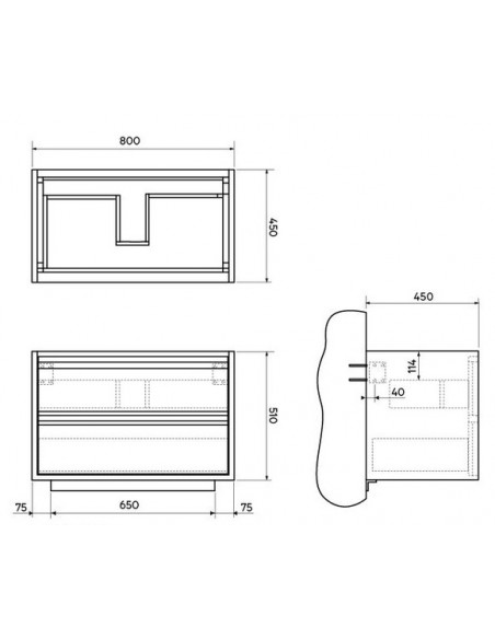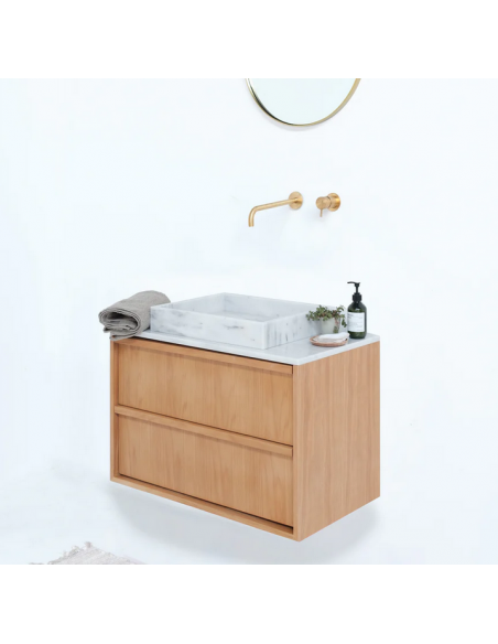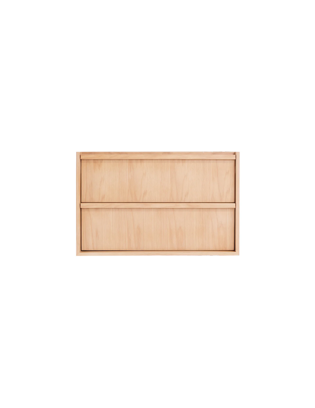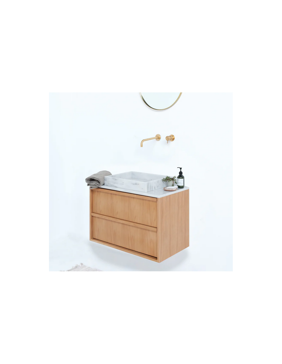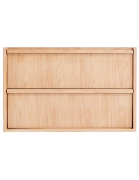 Vægmonteret underskab til håndvask og topplade, udført i et design af egetræsfarvet MDF. Underskabet måler 51 cm i højden og 80 x 45 cm i bredde og dybde (ydermål). Til underskabet kan eksempelvis anvendes topplade (Klik her) hvor topplader med bredden 80 cm passer. I skabet forefindes 2 skuffer.