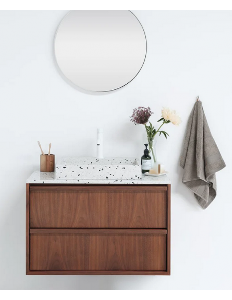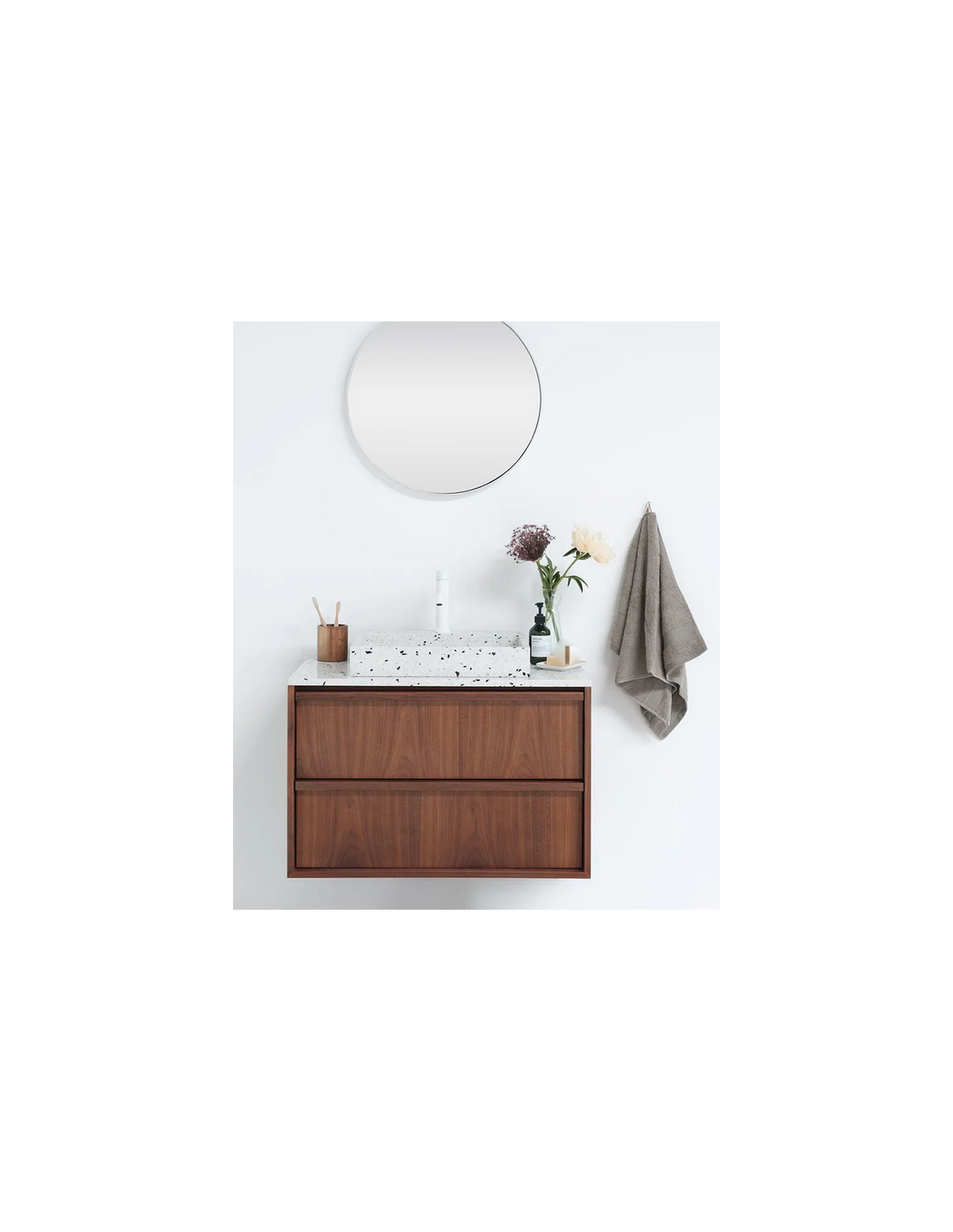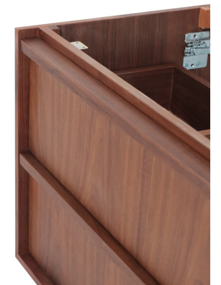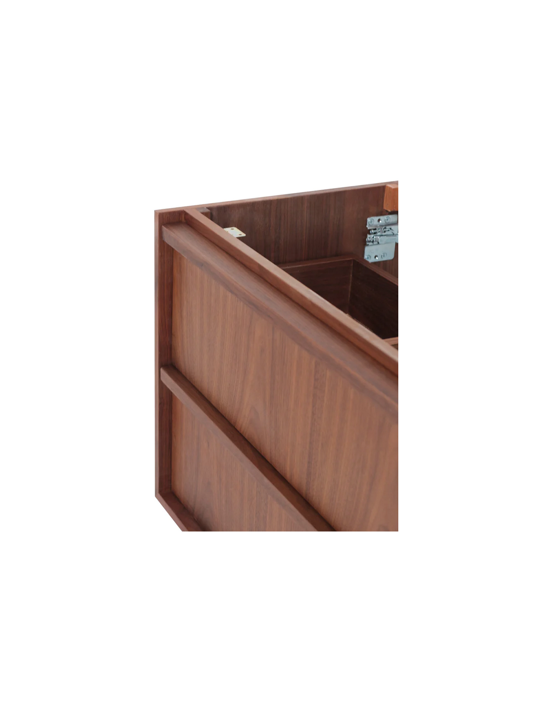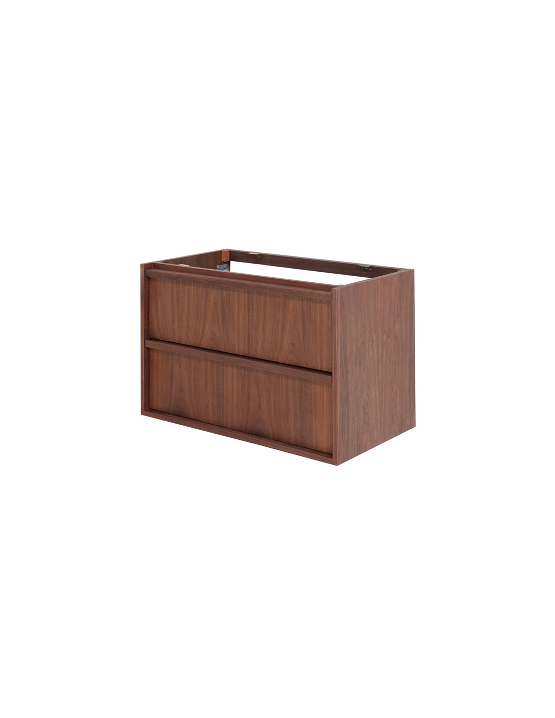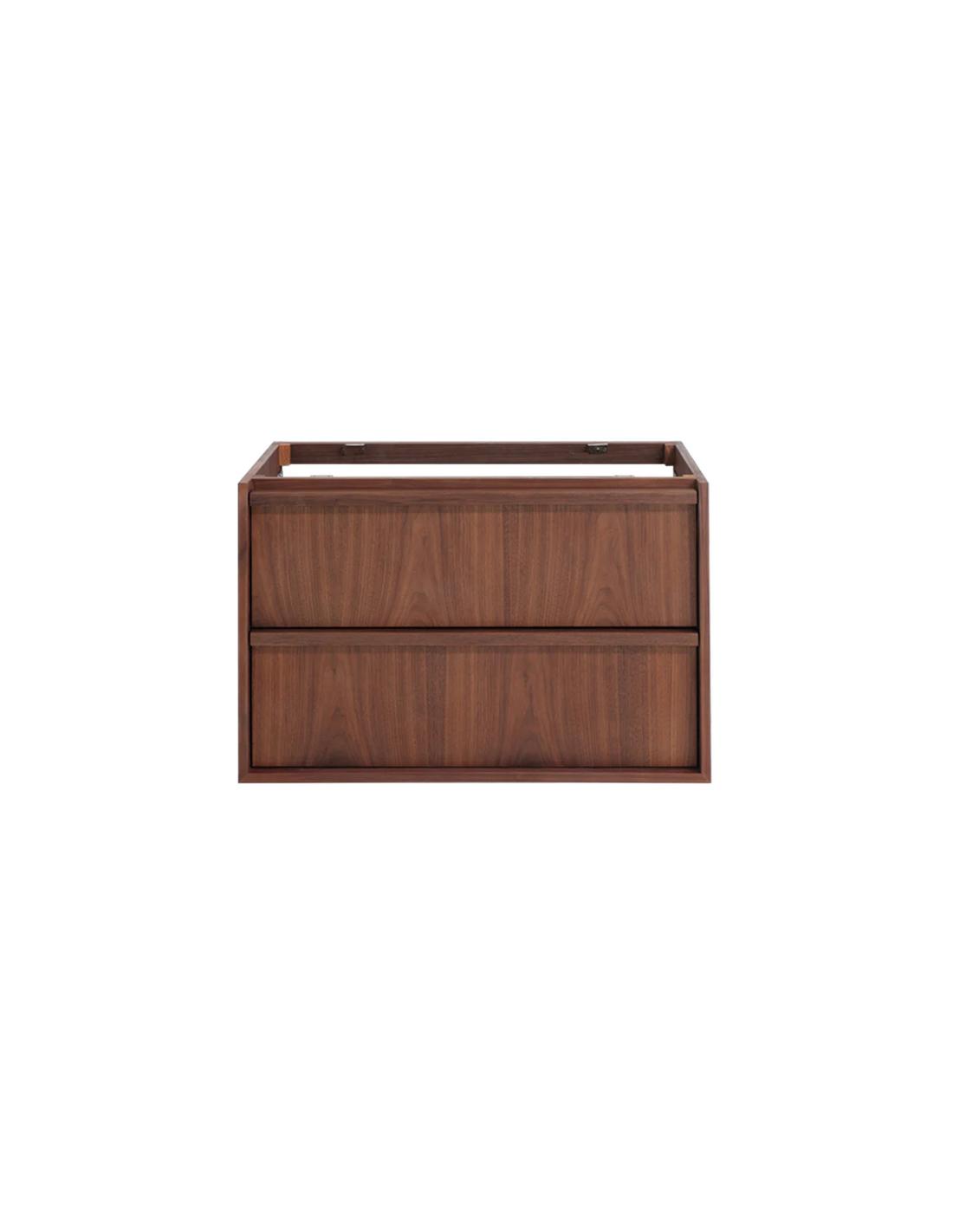 Vægmonteret underskab til håndvask og topplade, udført i et design af valnøddetræsfarvet MDF. Underskabet måler 51 cm i højden og 80 x 45 cm i bredde og dybde (ydermål). Til underskabet kan eksempelvis anvendes topplade (Klik her) hvor topplader med bredden 80 cm passer. I skabet forefindes 2 skuffer.