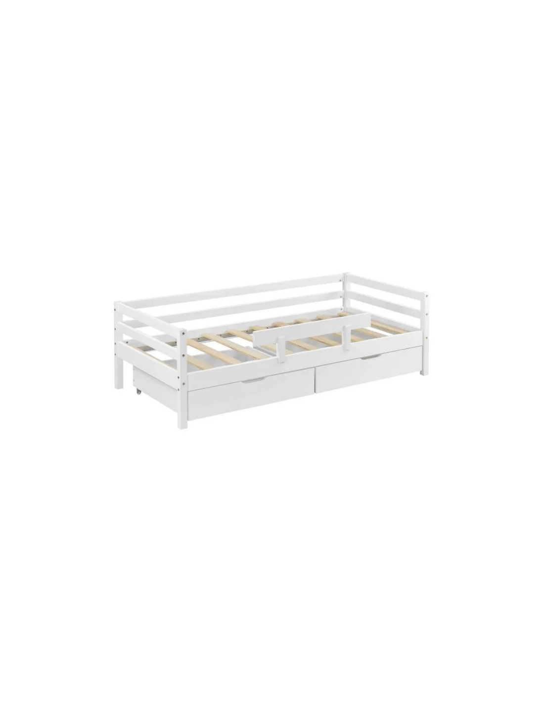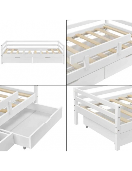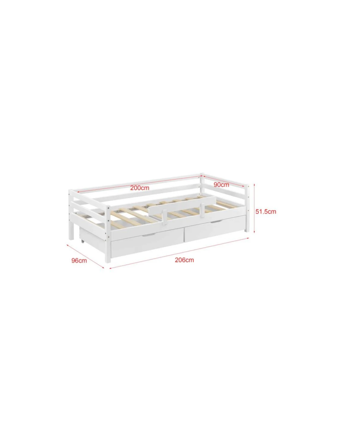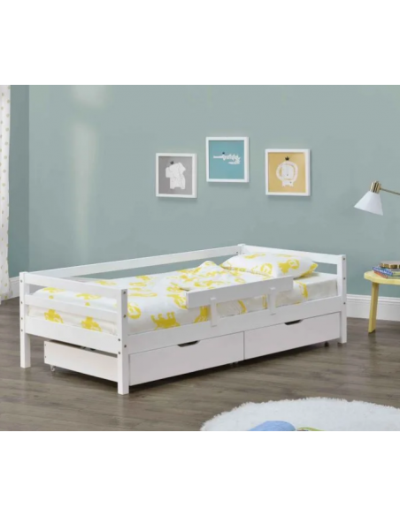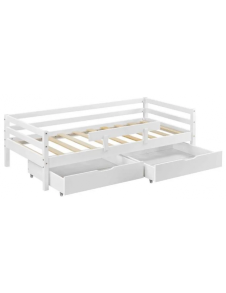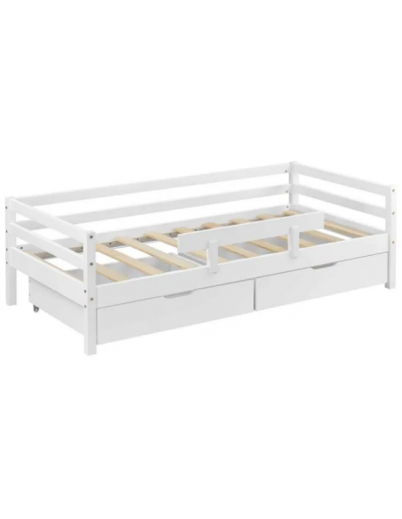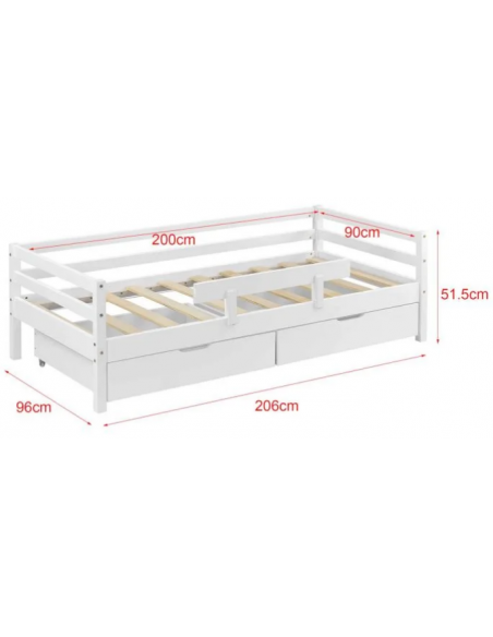 Børneseng med lamelbund, sidebeskyttelse og 2 skuffer, udført i et design af hvidlakeret fyrretræ. Sengen måler 206 x 96 cm i bredde og dybde, og passer til madrasser på 90 x 200 cm.