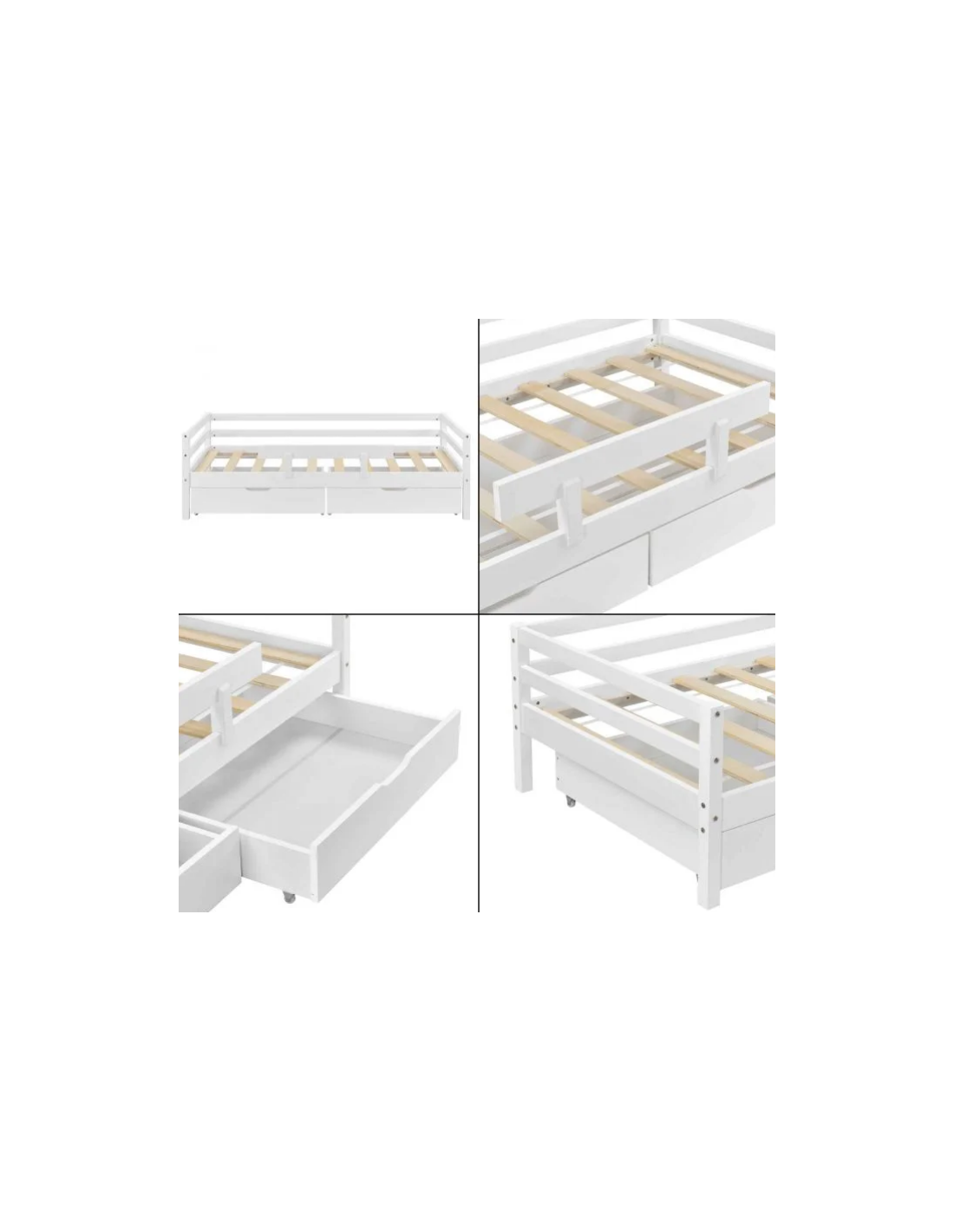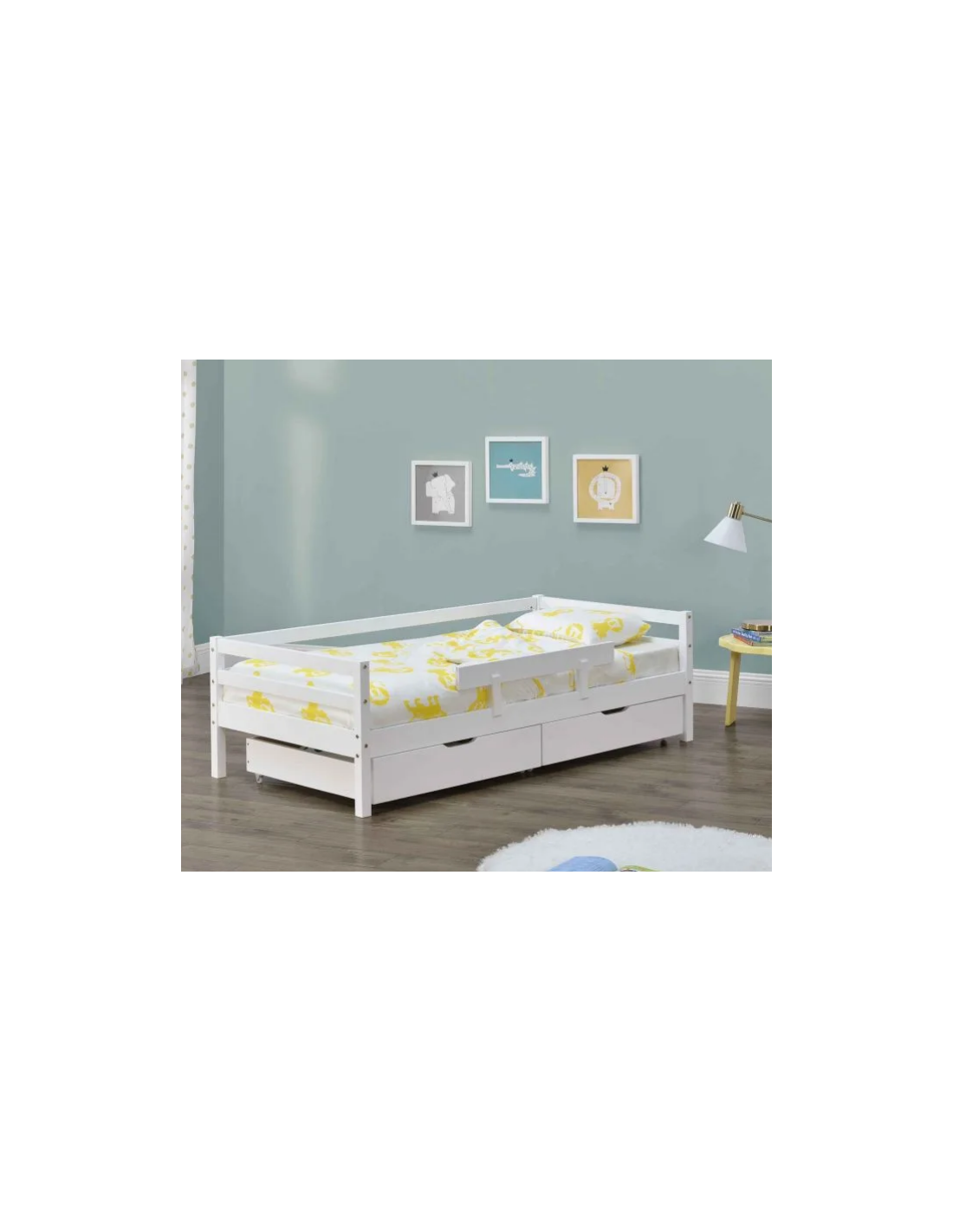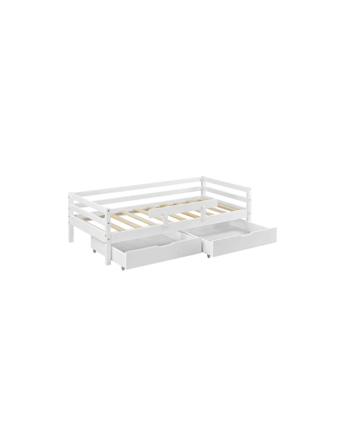 Børneseng med lamelbund, sidebeskyttelse og 2 skuffer, udført i et design af hvidlakeret fyrretræ. Sengen måler 206 x 96 cm i bredde og dybde, og passer til madrasser på 90 x 200 cm.