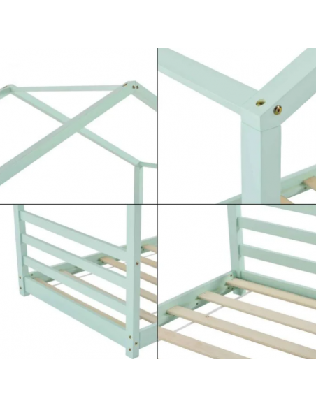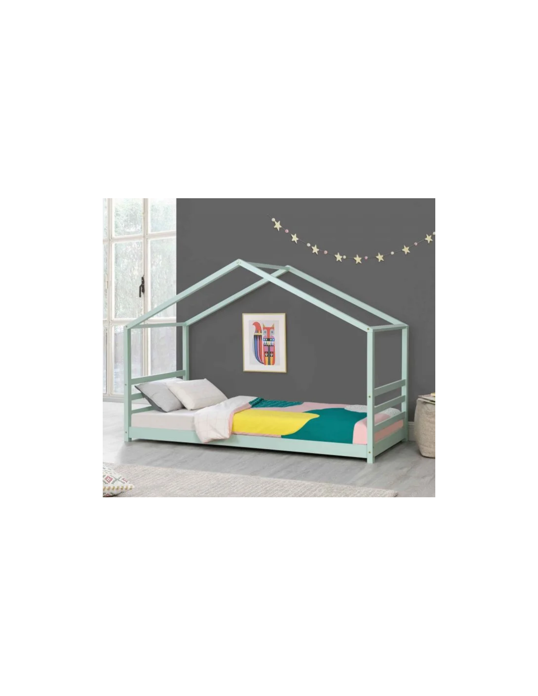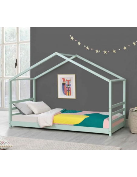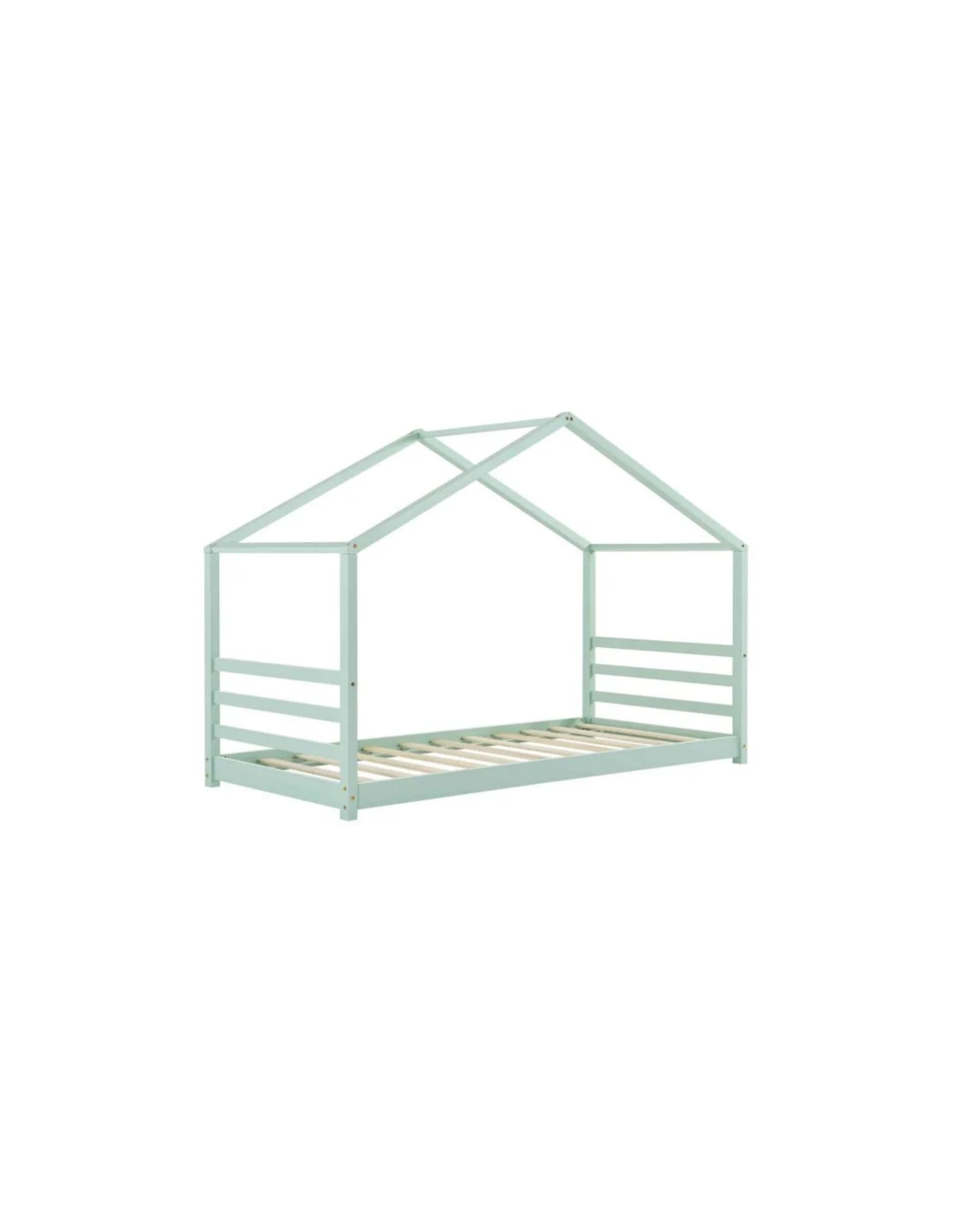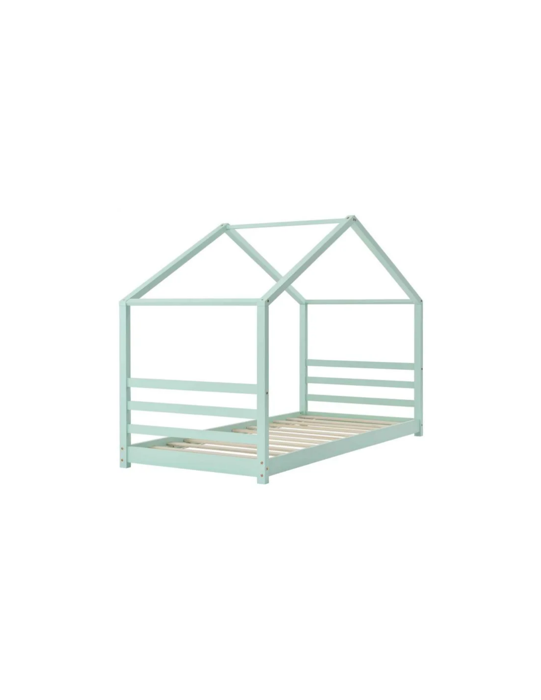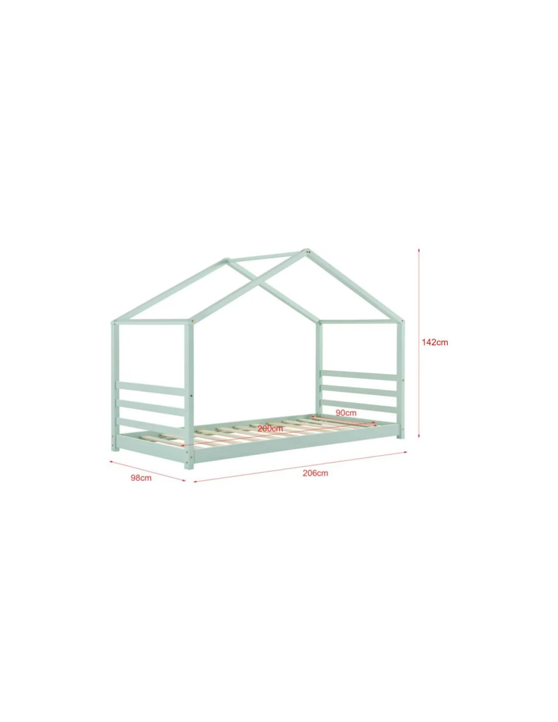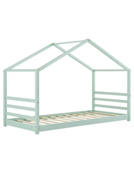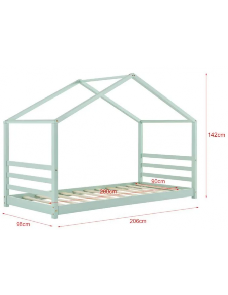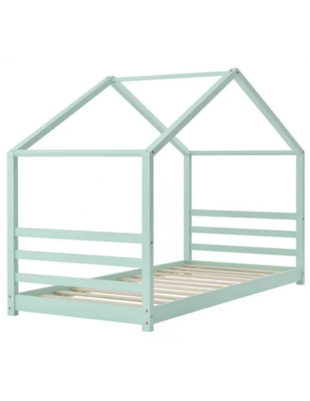 Børneseng med lamelbund, udført i et design af mint lakeret fyrretræ. Sengen måler 206 x 98 cm i bredde og dybde, og passer til madrasser på 90 x 200 cm.