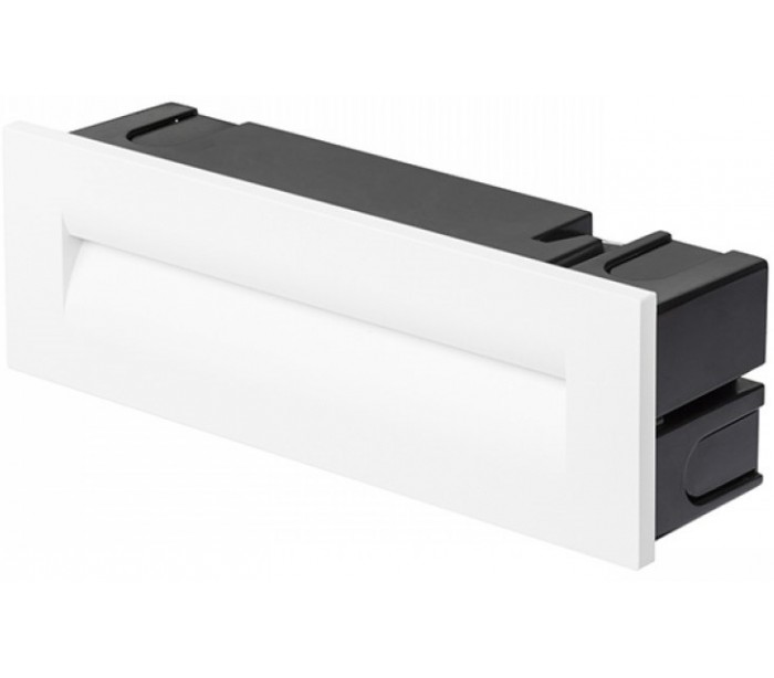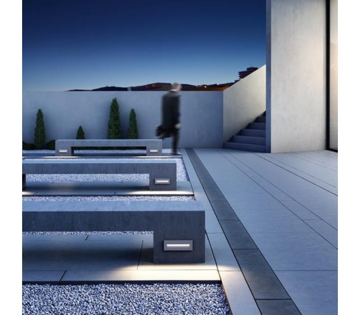 Rasq udendørs væglampe til indbygning, udført i et moderne design af antracitlakeret aluminium og nedadgående belysning med 8,5W LED lyskilde. Lampen måler 25 x 8,6 cm i bredde og højde (frontmål).