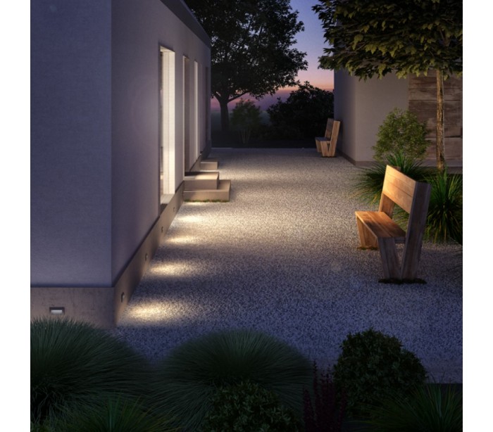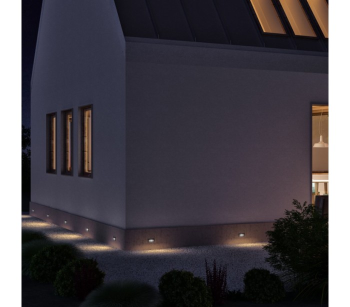 Gordiq L udendørs væglampe til indbygning, udført i et moderne design af antracitlakeret aluminium og nedadgående belysning med 3W LED lyskilde. Lampen måler 14 x 7 cm i bredde og højde (frontmål).