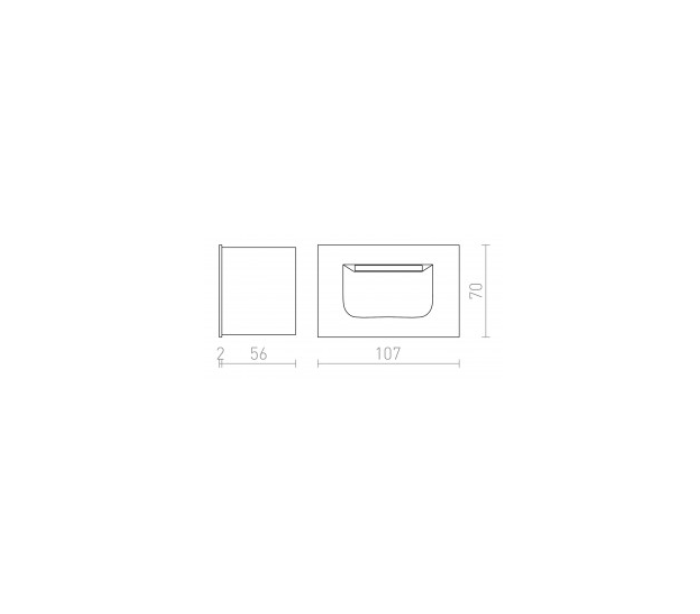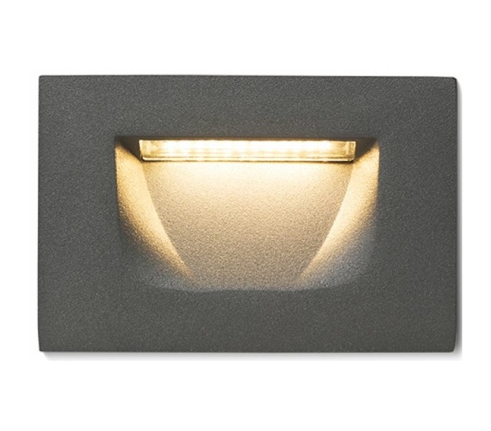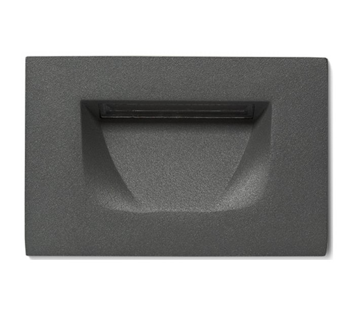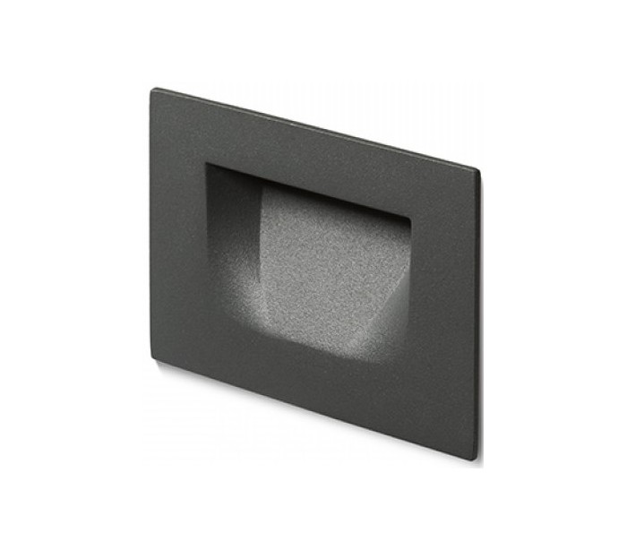 Per udendørs væglampe til indbygning, udført i et moderne design af antracit lakeret aluminium og nedadgående belysning med 3W LED lyskilde. Lampen måler 10,7 x 7 cm i bredde og højde (frontmål).