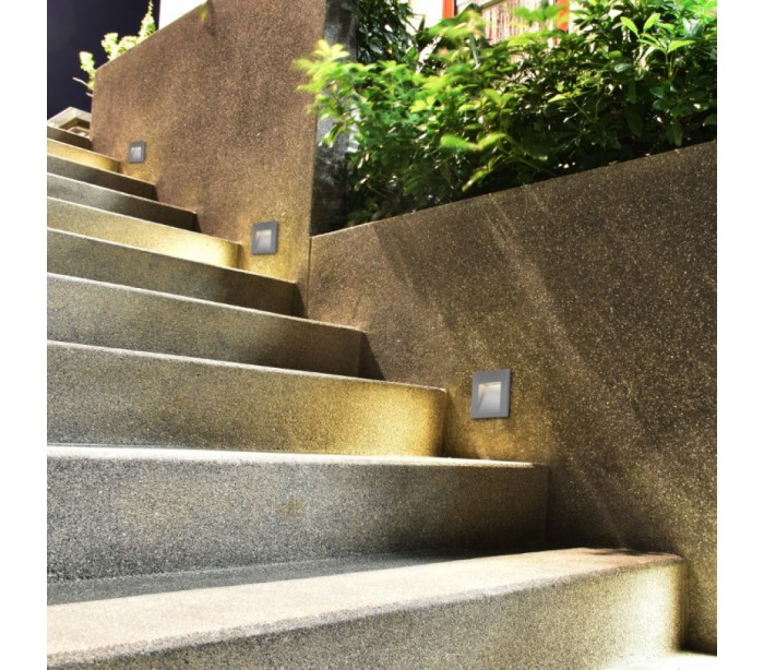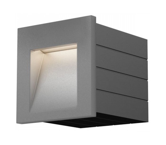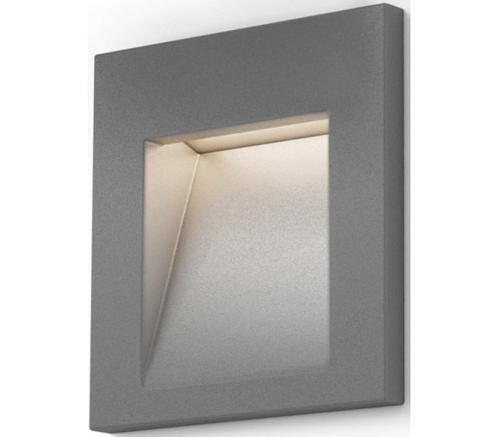 Tess SQ udendørs væglampe til indbygning, udført i et moderne design af sølvgrå lakeret aluminium og nedadgående belysning med 3W LED lyskilde. Lampen måler 6,4 x 6,7 cm i bredde og højde (frontmål).