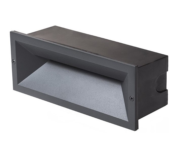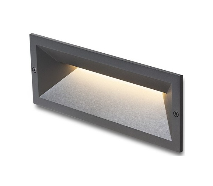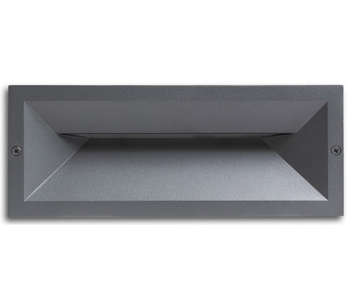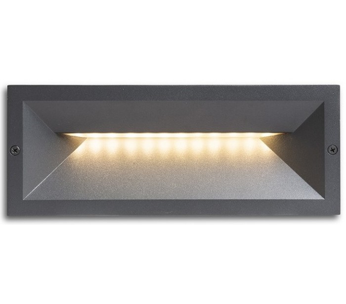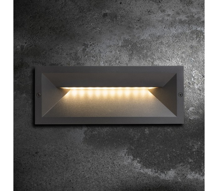 RAGG udendørs væglampe til indbygning, udført i et moderne design af antracitsort lakeret aluminium og nedadgående belysning med 12W LED lyskilde. Lampen måler 25 x 9,8 cm i bredde og højde (frontmål).