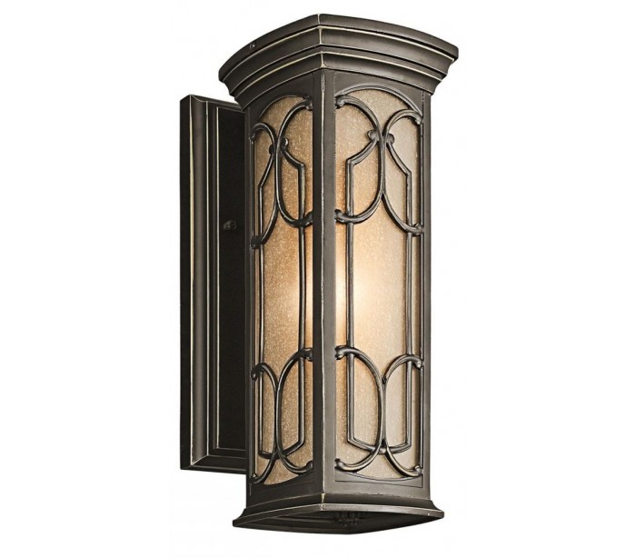 Franceasi udendørs væglampe i et rustikt design fra amerikanske Kichler. Væglampen leveres til europæisk standard til 1 x E27 lyskilde. Lampen måler 36,8 cm i højden og 14 cm i bredden.