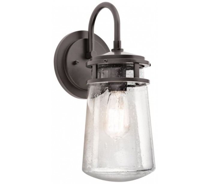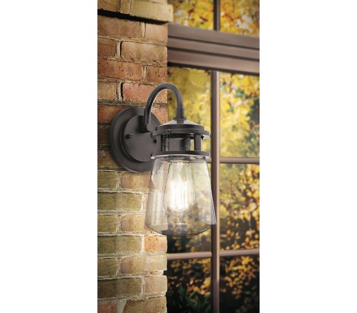 Lyndon udendørs væglampe i et rustikt design fra amerikanske Kichler. Væglampen leveres til europæisk standard til 1 x E27 lyskilde. Lampen måler 38,1 cm i højden og 15,2 cm i bredden.