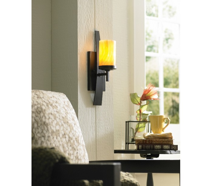 Kyle væglampe i et sandt amerikansk design fra Quoizel. Lampen måler 40,6 cm i højden og leveres til europæisk standard til 1 x E27 lyskilde. Lampen er udført i mørk bronzelakeret jern og med skærm i onyx glas.
