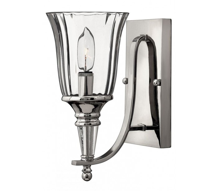 Chandon væglampe i et amerikansk design fra Hinkley. Lampen måler 29,2 cm i højden og leveres til europæisk standard til 1 x E14 lyskilde. Lampen er udført i et design af sølvlakeret stål og med skærm i krystalglas.