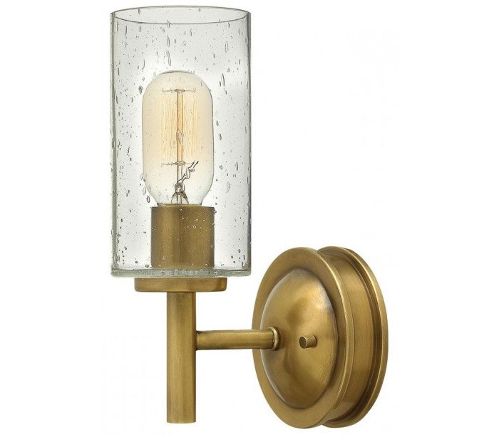 Collier væglampe i et amerikansk design fra Hinkley. Lampen måler 26,2 cm i højden og leveres til europæisk standard til 1 x E27 lyskilde. Lampen er udført i et design af rustik messinglakeret stål og med skærm i glas.