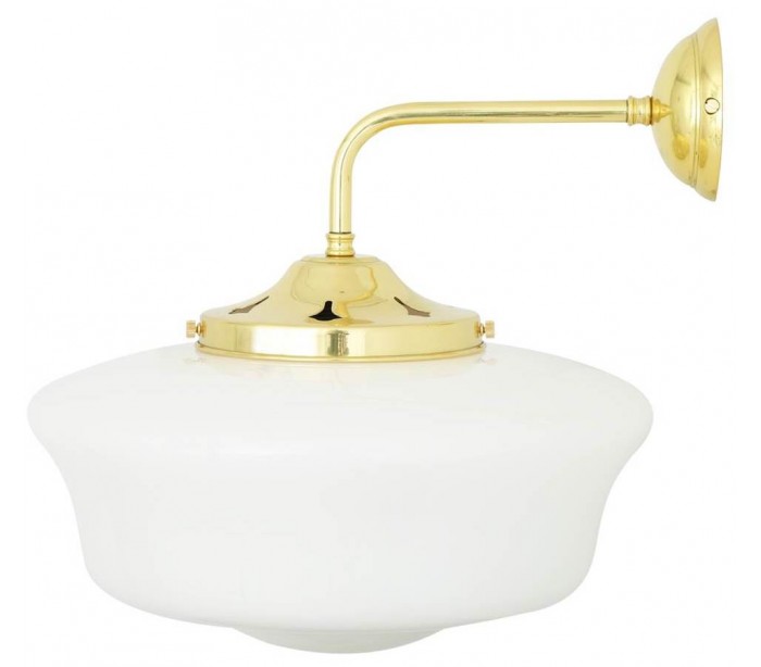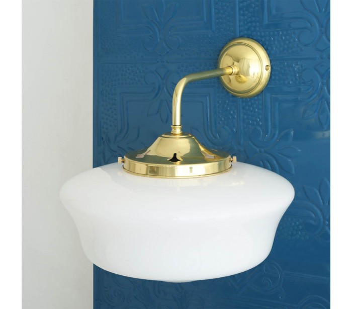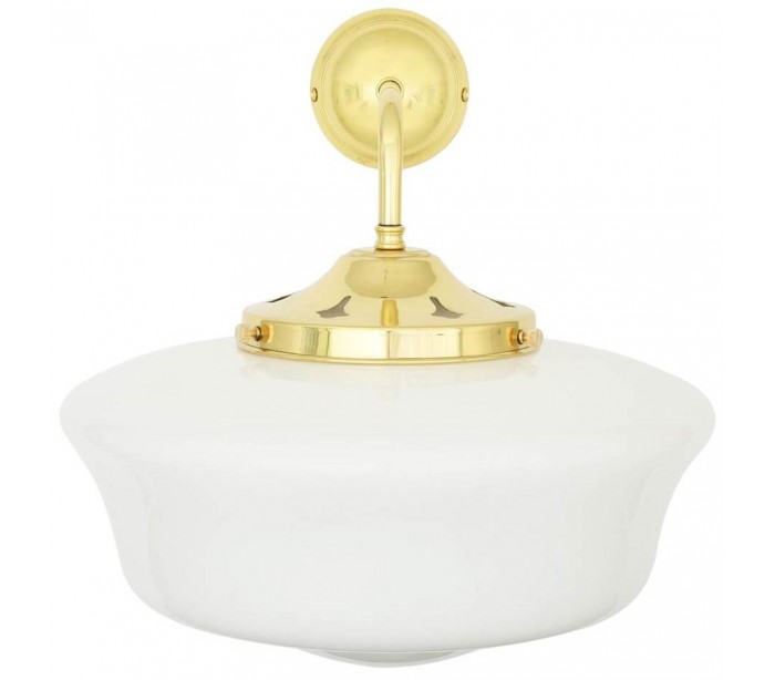 Schoolhouse væglampe fremstillet i et moderne design i poleret messing og med skærm i hvid glas. Lampen måler 35 cm i højden og anvender 1 x E27 lyskilde (Ekskl.).