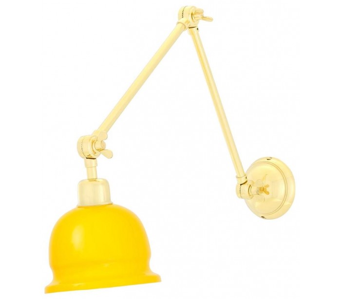 Nico væglampe fremstillet i et industrielt design i poleret messing og med justerbare led. Skærmen er i gul lakeret messing og lampen måler 45 - 79 cm i højden og anvender 1 x E27 lyskilde (Ekskl.).