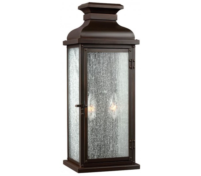 Pediment væglampe i et rustikt design fra amerikanske Feiss. Lampen leveres til europæisk standard til 2 x E14 lyskilder og måler 46 cm i højden.