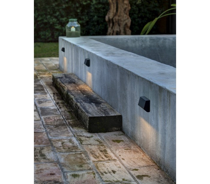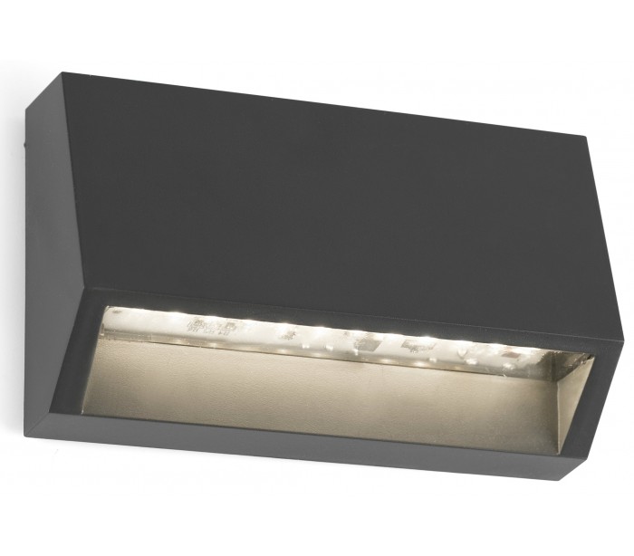 Must udendørs væglampe i et moderne design, fremstillet i mørkegrå lakeret aluminium. Lampen måler 9,6 cm i bredden og anvender 1 x SMD LED lyskilde på 2W (Inkl.). Lampen kræver ikke indbygning i væggen.