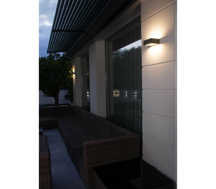 Alp udendørs væglampe i et moderne design, fremstillet i mørkegrå lakeret aluminium. Lampen måler 6 cm i højden og anvender 1 x SMD LED lyskilde på 8W (Inkl.).