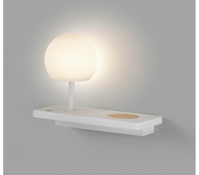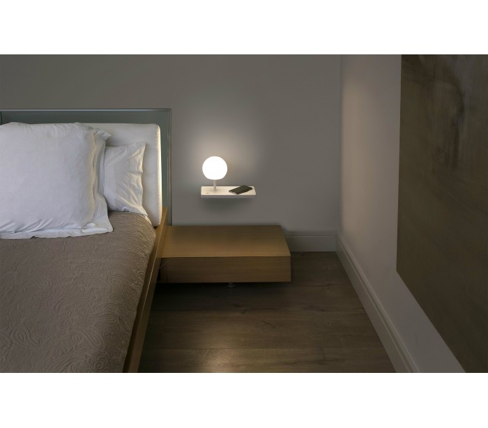 Væglampe med trådløs mobiloplader og dæmpbar lysfunktion, fremstillet i hvidlakeret aluminium. Lampen er til montering på væggen og kan derfor anvendes som sengebord. Lampen måler 30 cm i bredden og anvender 1 x LED lyskilde på 7W (Inkl.).