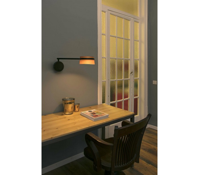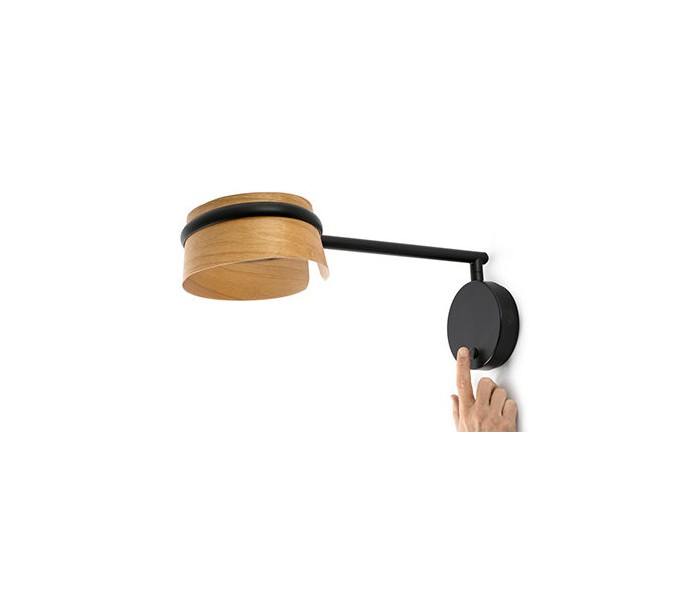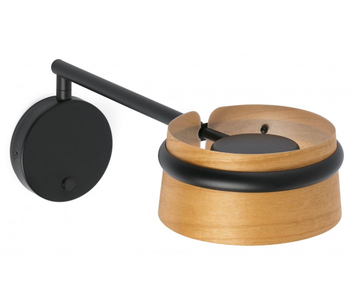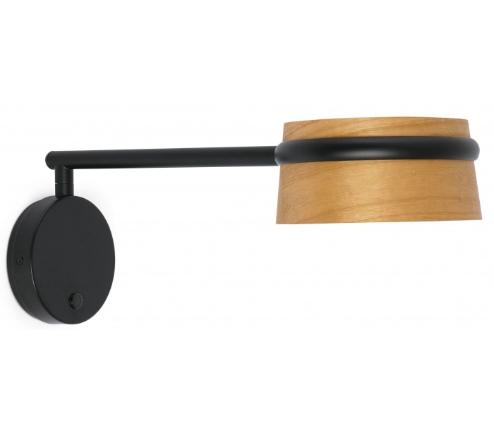 Væglampe i et moderne design, fremstillet i sortlakeret aluminium og med skærm i træfinér. Lampen måler 21,5 cm i højden og 50 cm i dybde/fremspring. Lampen anvender 1 x LED lyskilde på 6W (Inkl.).