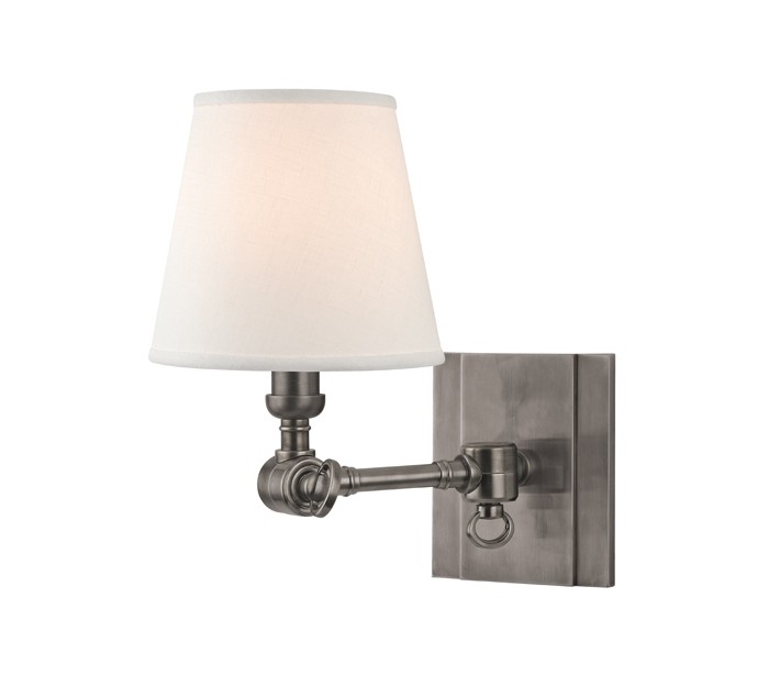 Hillsdale væglampe i et design, fremstillet i antik nikkel lakeret messing og med skærm i hvid linned. Væglampen måler 25,5 cm i højden og anvender 1 x E14 lyskilde. Lampearmen kan justeres frem/tilbage samt fra side til side.