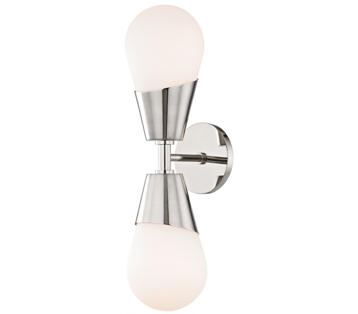 Cora væglampe i et design, fremstillet i poleret nikkel lakeret stål og med skærm i hvid glas. Væglampen måler 48,3 cm i højden og anvender 2 x E27 lyskilder.