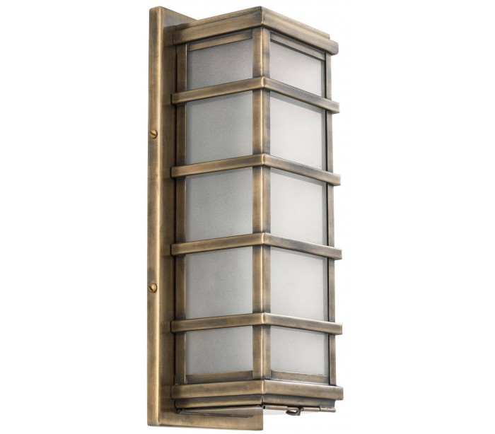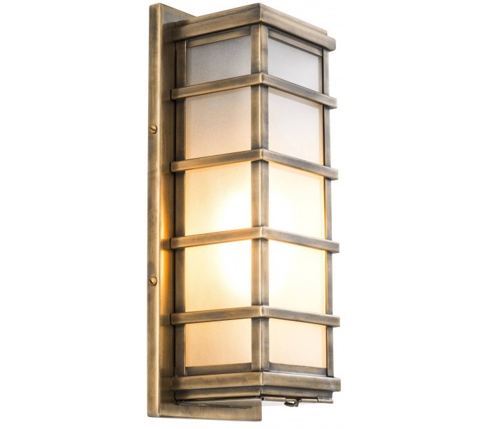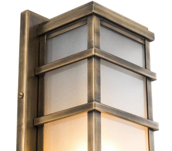Eichholtz Welby væglampe udført i et design af antik messinglakeret stål og med skærm i frostet glas. Lampen måler 39 cm i højden og 11 cm i bredden. Bemærk at lampen er mere fordelagtig til hyggebelysning, fremfor direkte belysning.