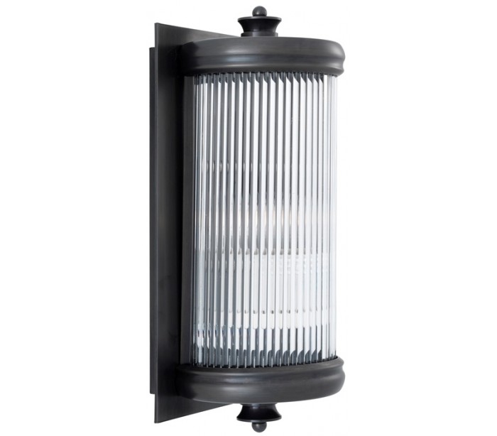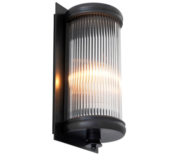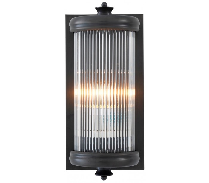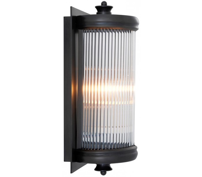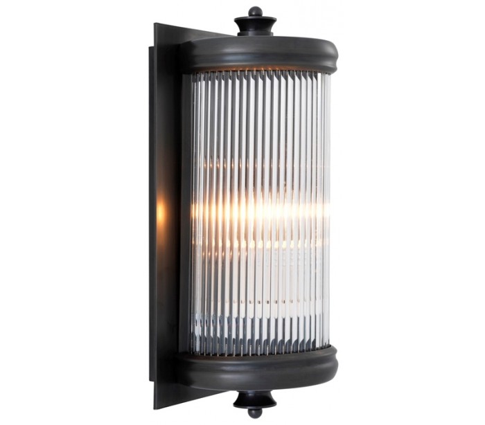 Eichholtz Glorious S væglampe udført i et design af antik bronzelakeret stål og med skærm i klart rillet glas. Lampen måler 29 cm i højden og 13 cm i bredden. Bemærk at lampen er mere fordelagtig til hyggebelysning, fremfor direkte belysning.