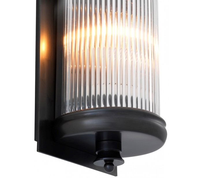 Eichholtz Glorious L væglampe udført i et design af antik bronzelakeret stål og med skærm i klart rillet glas. Lampen måler 43 cm i højden og 13 cm i bredden. Bemærk at lampen er mere fordelagtig til hyggebelysning, fremfor direkte belysning.