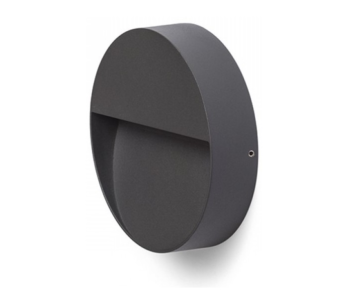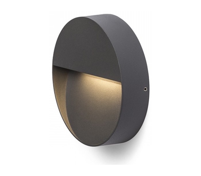 Aqila R udendørs væglampe udført i et moderne design af antracitlakeret metal med 6W LED lyskilde. Lampen måler 15 cm i diameter.