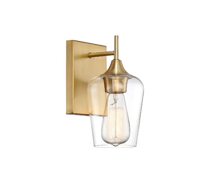 Octave 1 væglampe udført i et design af varm messinglakeret stål og med skærm i klart glas. Lampen er fra amerikanske Savoy House og anvender 1 x E27 lyskilde og måler 24 cm i højden og 13 x 15 cm i bredde og dybde/fremspring.