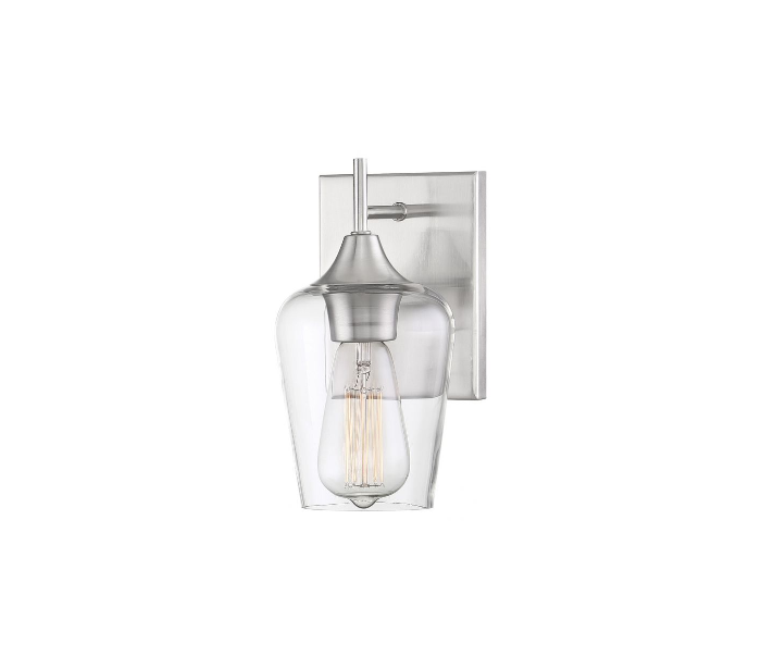Octave 1 væglampe udført i et design af satineret nikkel lakeret stål og med skærm i klart glas. Lampen er fra amerikanske Savoy House og anvender 1 x E27 lyskilde og måler 24 cm i højden og 13 x 15 cm i bredde og dybde/fremspring.