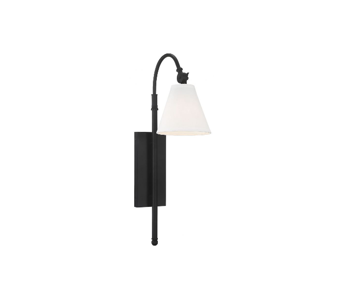 Rutland 1 væglampe udført i et design af mat sortlakeret stål og med skærm i hvid tekstil. Lampen er fra amerikanske Savoy House og anvender 1 x E27 lyskilde og måler 62 cm i højden og 16 x 29 cm i bredde og dybde/fremspring.