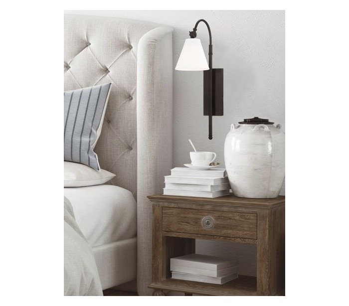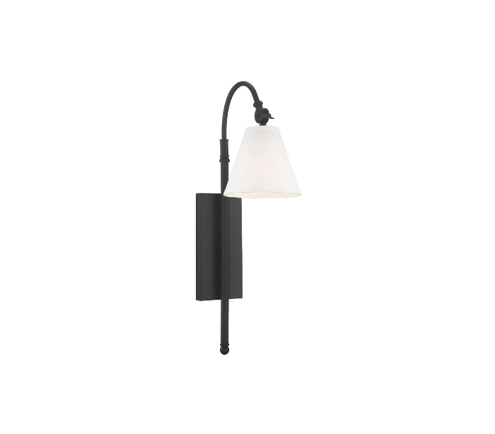 Rutland 1 væglampe udført i et design af bronzelakeret stål og med skærm i hvid tekstil. Lampen er fra amerikanske Savoy House og anvender 1 x E27 lyskilde og måler 62 cm i højden og 16 x 29 cm i bredde og dybde/fremspring.