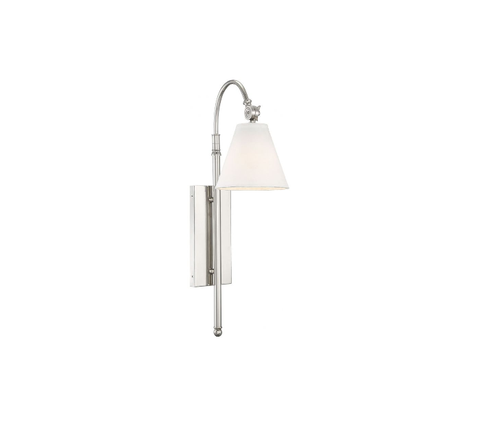 Rutland 1 væglampe udført i et design af poleret kromlakeret stål og med skærm i hvid tekstil. Lampen er fra amerikanske Savoy House og anvender 1 x E27 lyskilde og måler 62 cm i højden og 16 x 29 cm i bredde og dybde/fremspring.