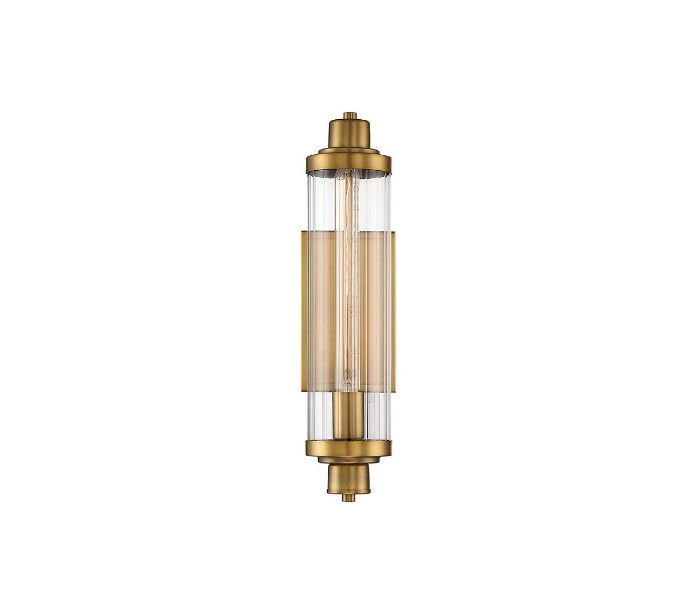 Pike 1 væglampe udført i et design af varm messinglakeret stål og med skærm i klart rillet glas. Lampen er fra amerikanske Savoy House og anvender 1 x E27 Tube lyskilde og måler 45 cm i højden og 12 x 17 cm i bredde og dybde/fremspring.