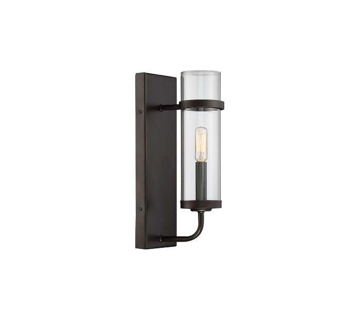 Tulsa 1 væglampe udført i et design af antik bronzelakeret stål og med skærm i klart glas. Lampen er fra amerikanske Savoy House og anvender 1 x E14 lyskilde og måler 35 cm i højden og 12 x 16 cm i bredde og dybde/fremspring.