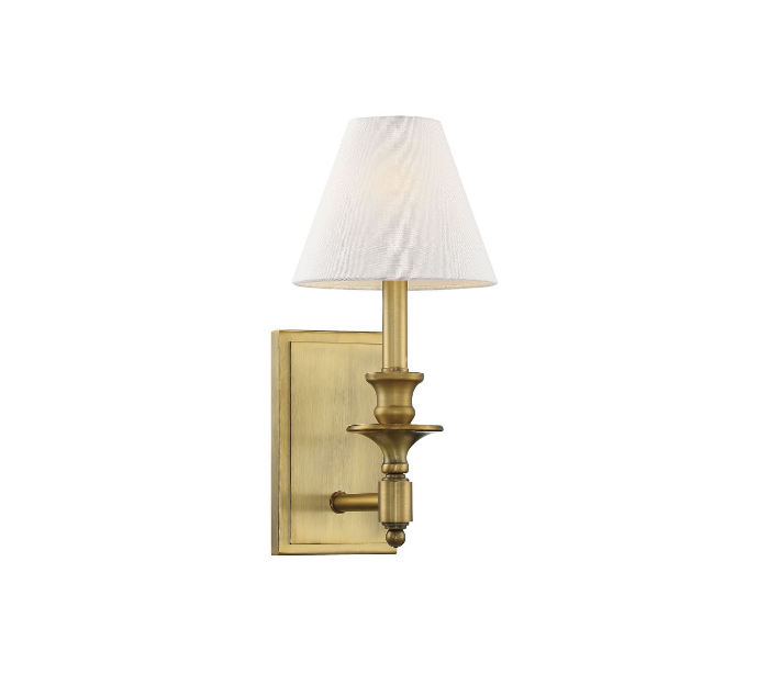 Washurn 1 væglampe udført i et design af varm messinglakeret stål og med skærm i hvid tekstil. Lampen er fra amerikanske Savoy House og anvender 1 x G9 lyskilde og måler 38 cm i højden og 18 x 23 cm i bredde og dybde/fremspring.