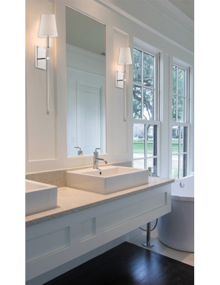 Monroe 1 væglampe udført i et design af satineret nikkel lakeret stål og med skærm i hvid tekstil. Lampen er fra amerikanske Savoy House og anvender 1 x G9 lyskilde og måler 61 cm i højden og 13 x 17 cm i bredde og dybde/fremspring.
