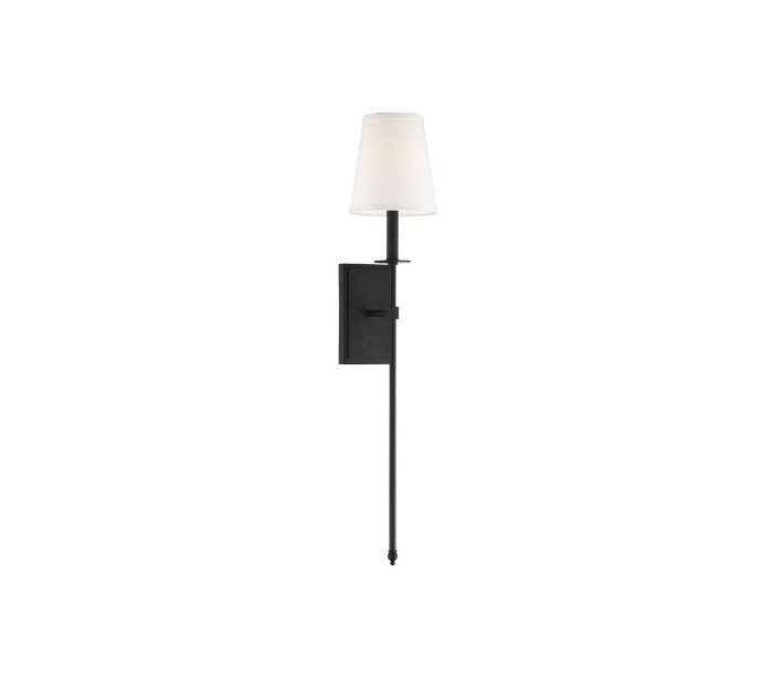 Monroe 1 væglampe udført i et design af mat sortlakeret stål og med skærm i hvid tekstil. Lampen er fra amerikanske Savoy House og anvender 1 x G9 lyskilde og måler 85 cm i højden og 17 x 20 cm i bredde og dybde/fremspring.