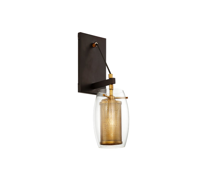 Dunbar 1 væglampe udført i et design af varm messing og antik bronzelakeret stål og med skærm i klart glas. Lampen er fra amerikanske Savoy House og anvender 1 x G9 lyskilde og måler 41 cm i højden og 12 x 15 cm i bredde og dybde/fremspring.