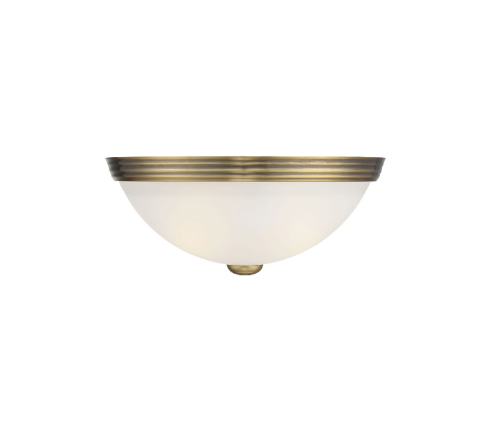 Halvrund væglampe udført i et design af varm messinglakeret stål og med skærm i hvid glas. Lampen er fra amerikanske Savoy House og anvender 2 x E27 lyskilder og måler 11 cm i højden og 28 x 12 cm i bredde og dybde/fremspring.