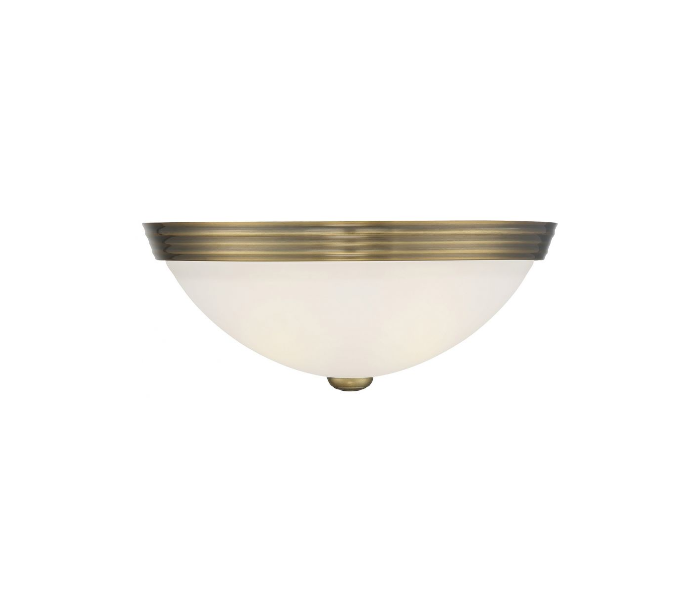 Halvrund væglampe udført i et design af varm messinglakeret stål og med skærm i hvid glas. Lampen er fra amerikanske Savoy House og anvender 2 x E27 lyskilder og måler 13 cm i højden og 33 x 14 cm i bredde og dybde/fremspring.