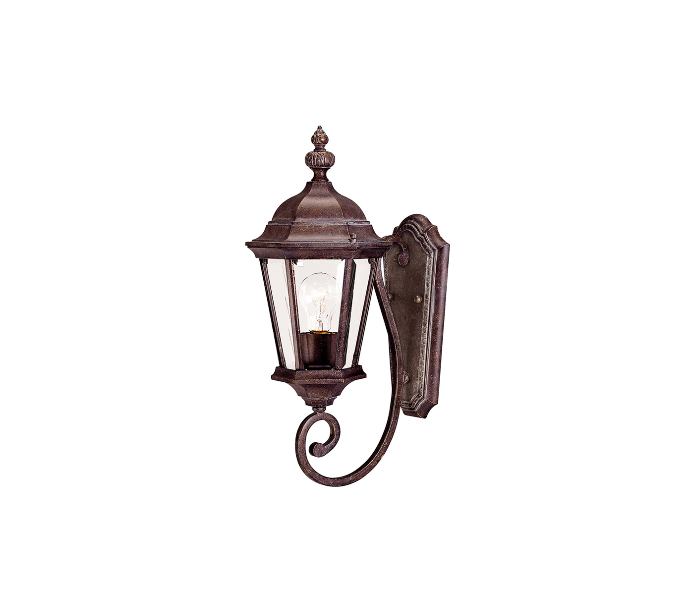 Wakefield 1 væglampe udført i et design af patineret valnøddefarvet metal og klart glas. Lampen er fra amerikanske Savoy House og anvender 1 x E27 lyskilde og måler 51 cm i højden og 20 - 26 cm i bredde og dybde/fremspring.