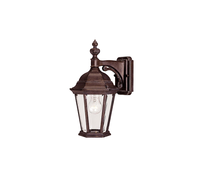 Wakefield 1 væglampe udført i et design af patineret valnøddefarvet metal og klart glas. Lampen er fra amerikanske Savoy House og anvender 1 x E27 lyskilde og måler 39 cm i højden og 20 - 26 cm i bredde og dybde/fremspring.